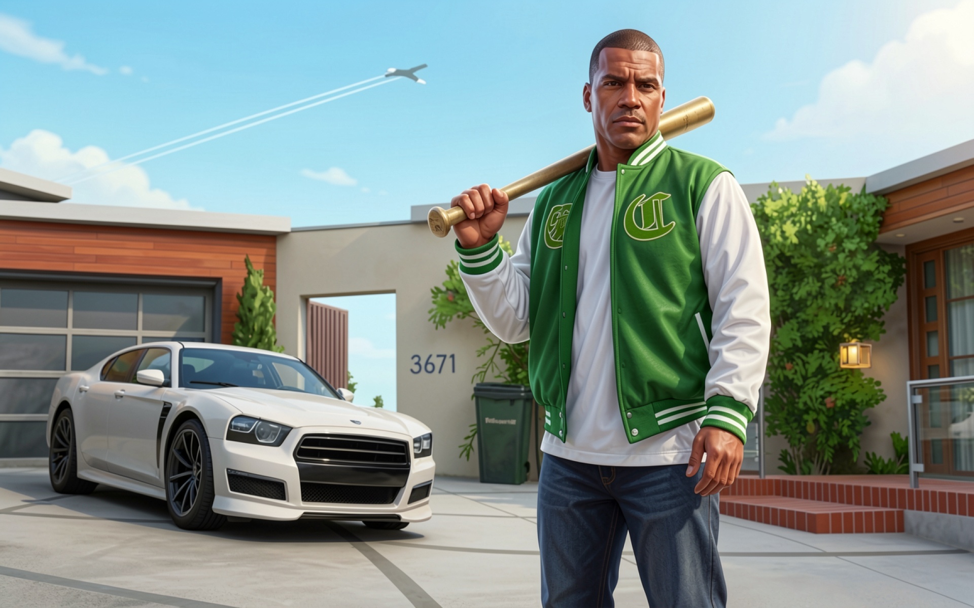 Мужчина в зеленом бомбере с бейсбольной битой