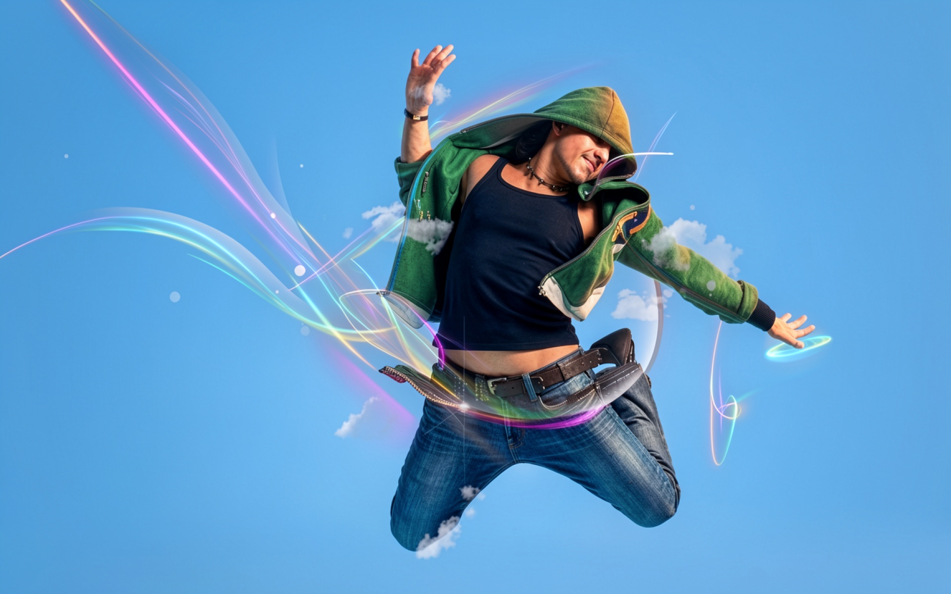 Парень в зеленом худи среди неоновых линий