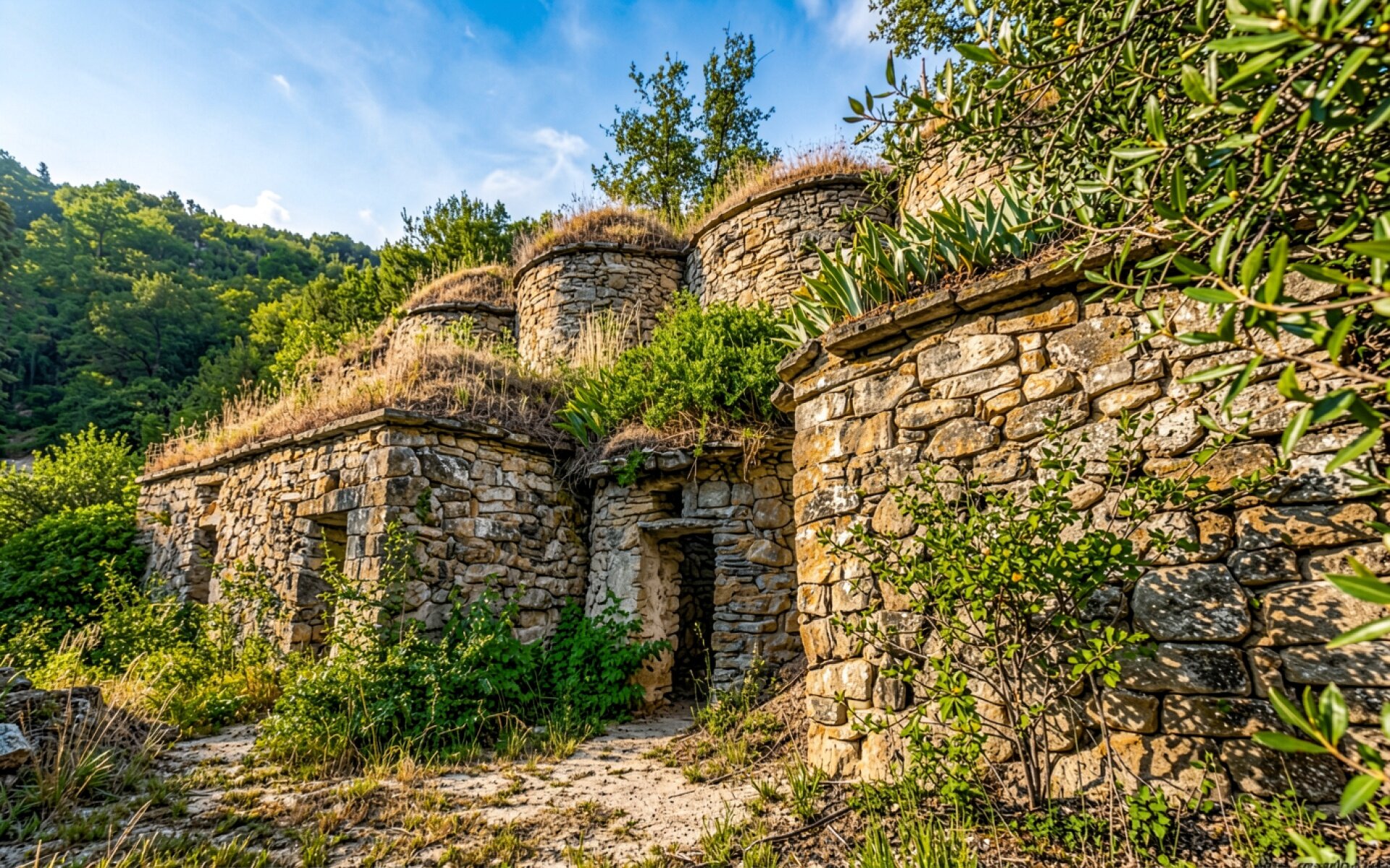 Древние каменные хижины в зеленом горном лесу