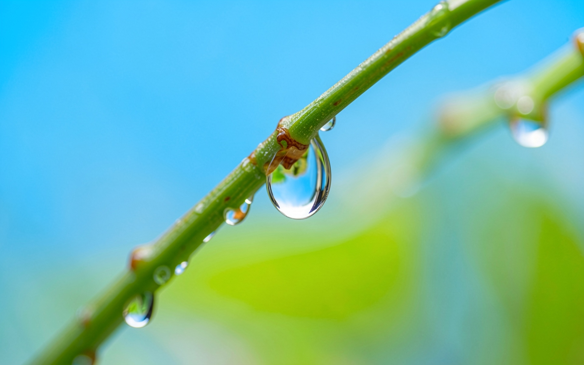 Капли росы на зеленом стебле растения