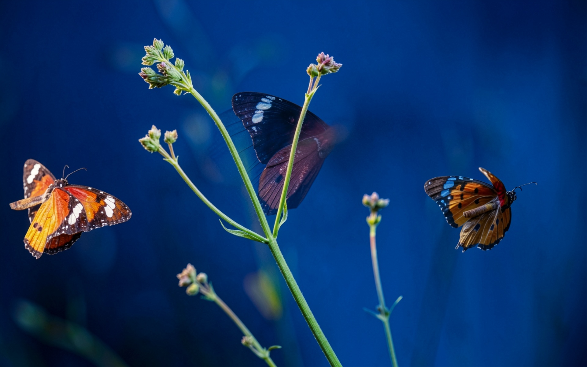 Три яркие бабочки на зеленом стебле