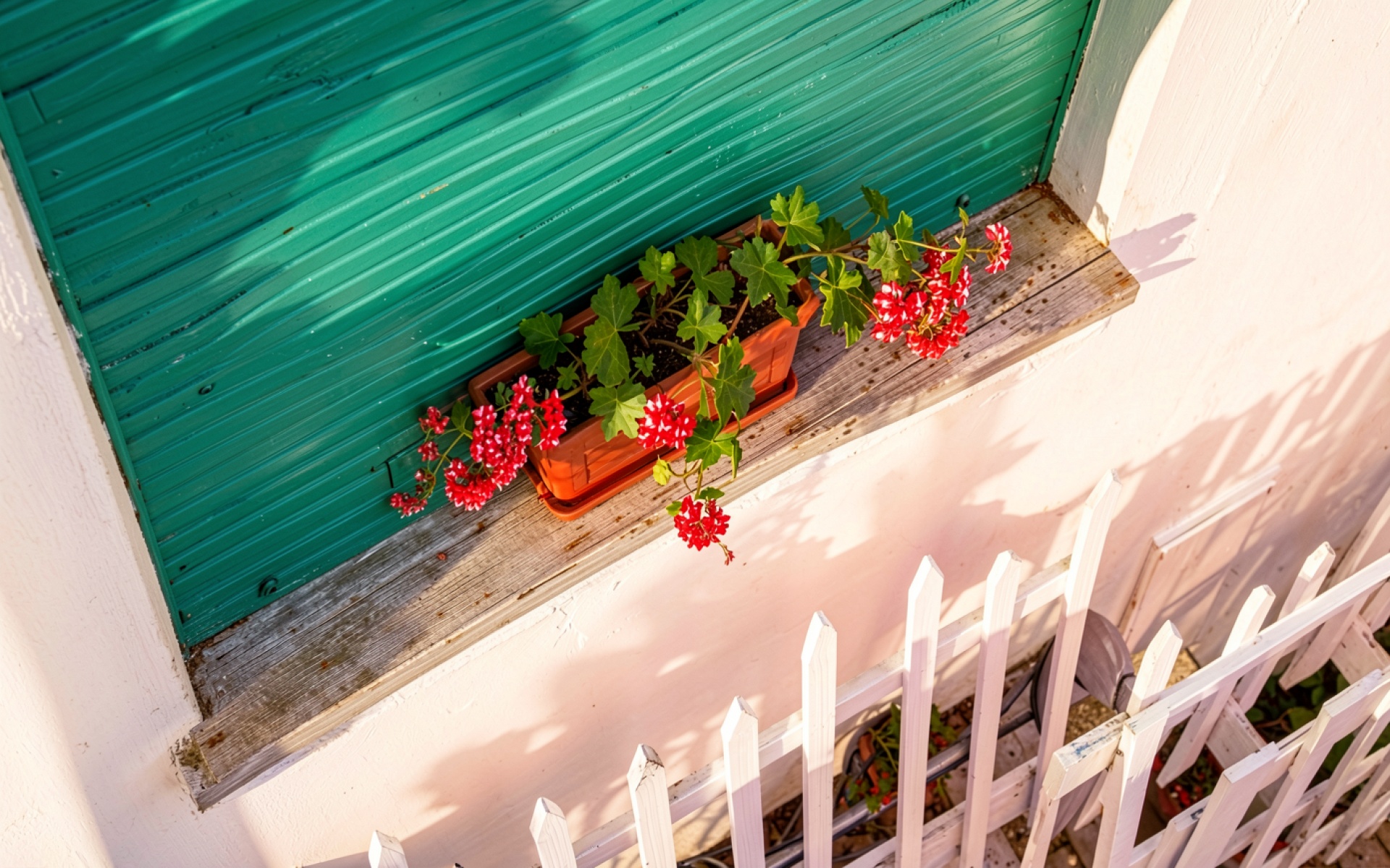 Красные цветы в горшке на зеленом окне