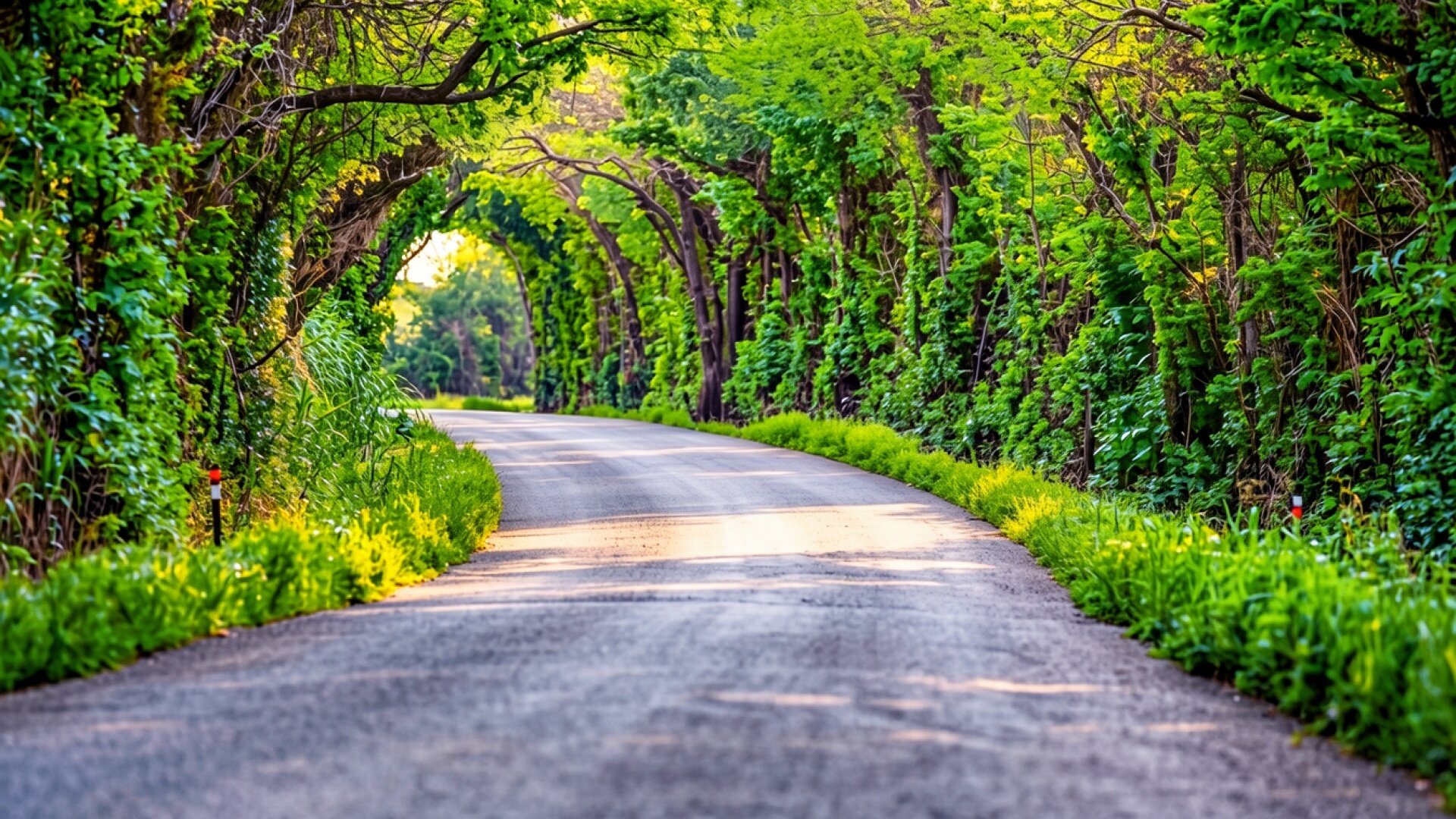 Летняя дорога сквозь зеленый лиственный лес