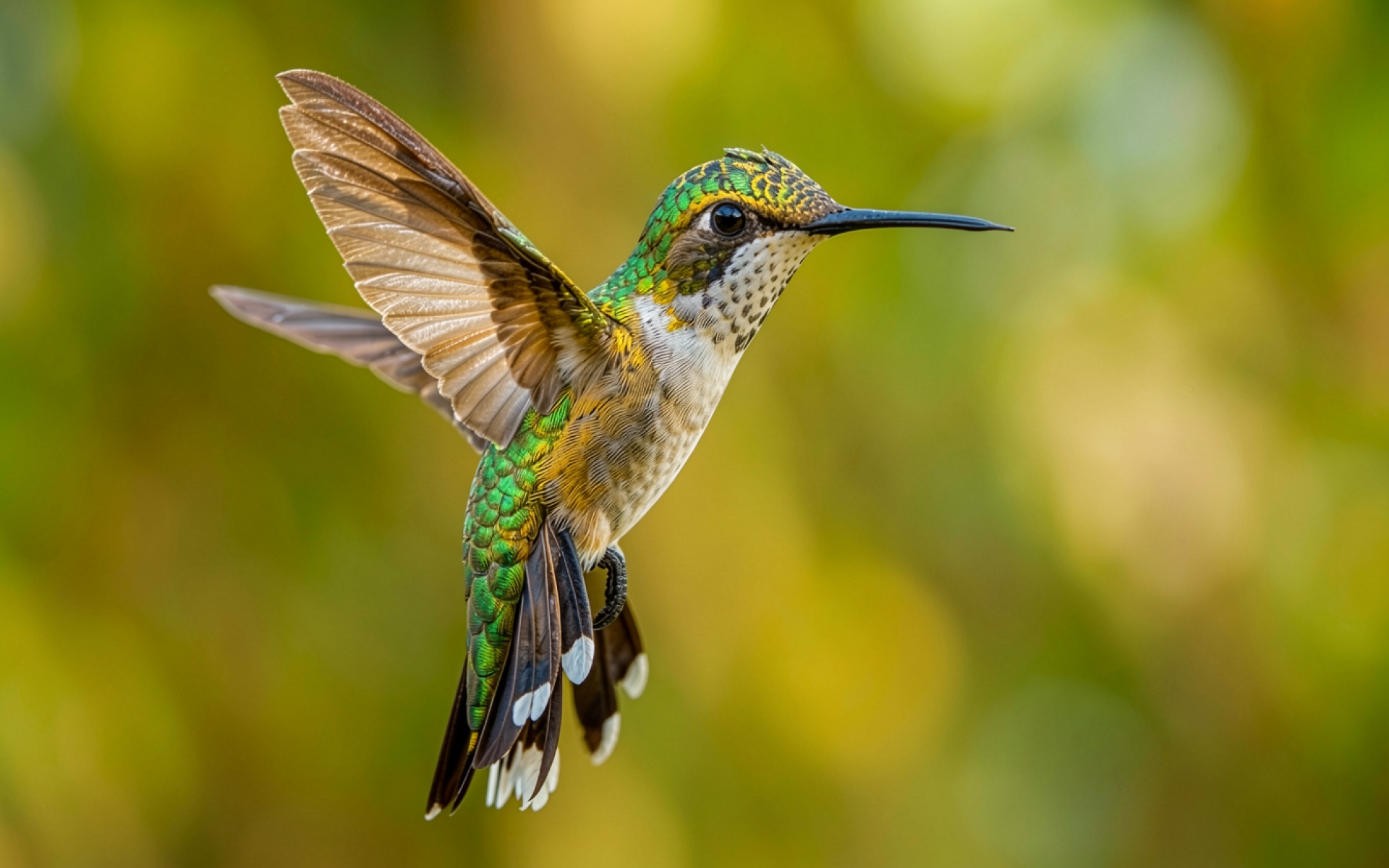 Зеленый колибри в полете на размытом фоне