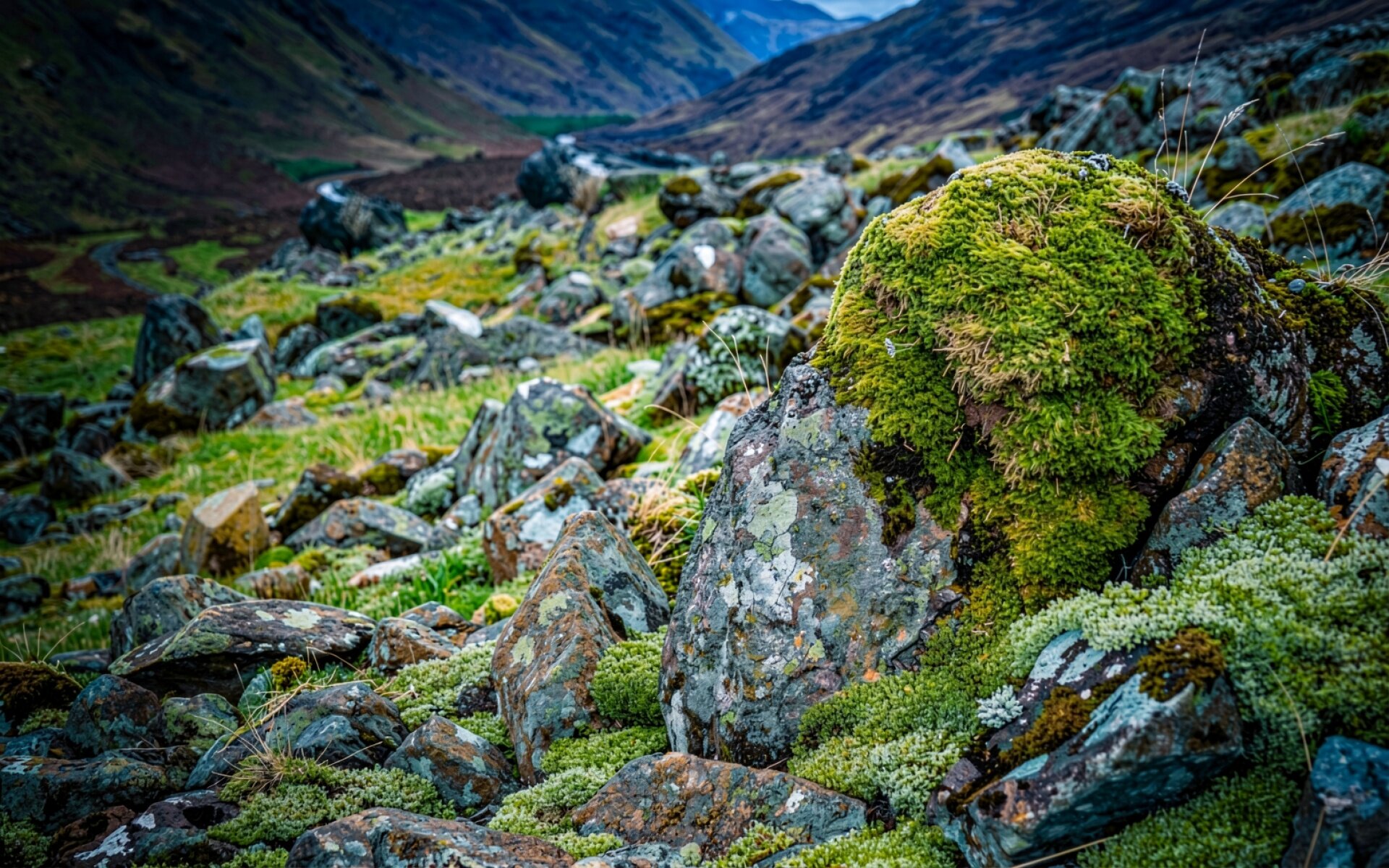 Зеленый мох на серых камнях в горах