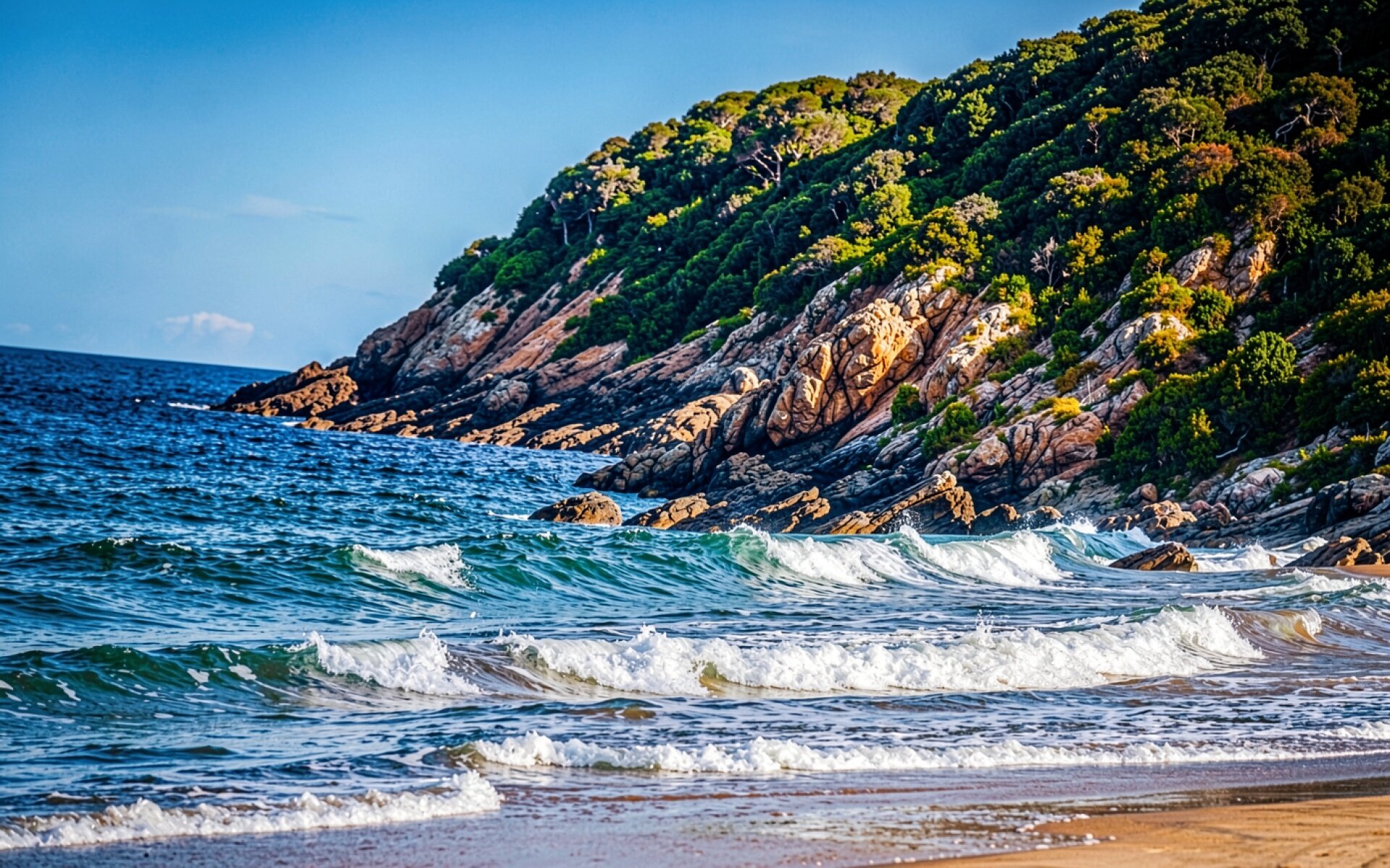 Скалистый берег океана с зеленым лесом