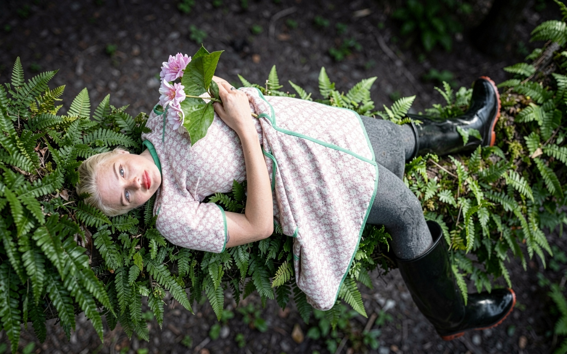 Девушка в платье среди зеленых папоротников