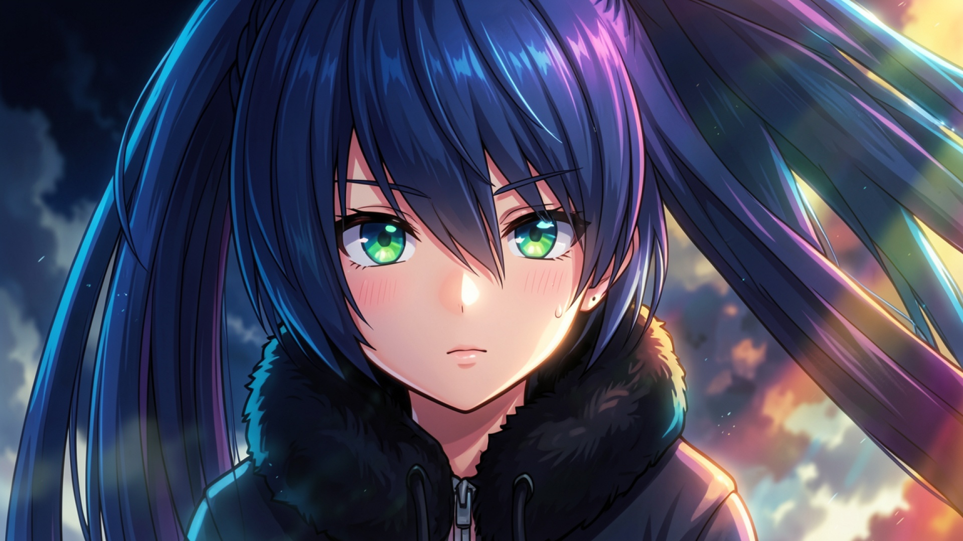 Аниме девушка с синими волосами в зимней куртке