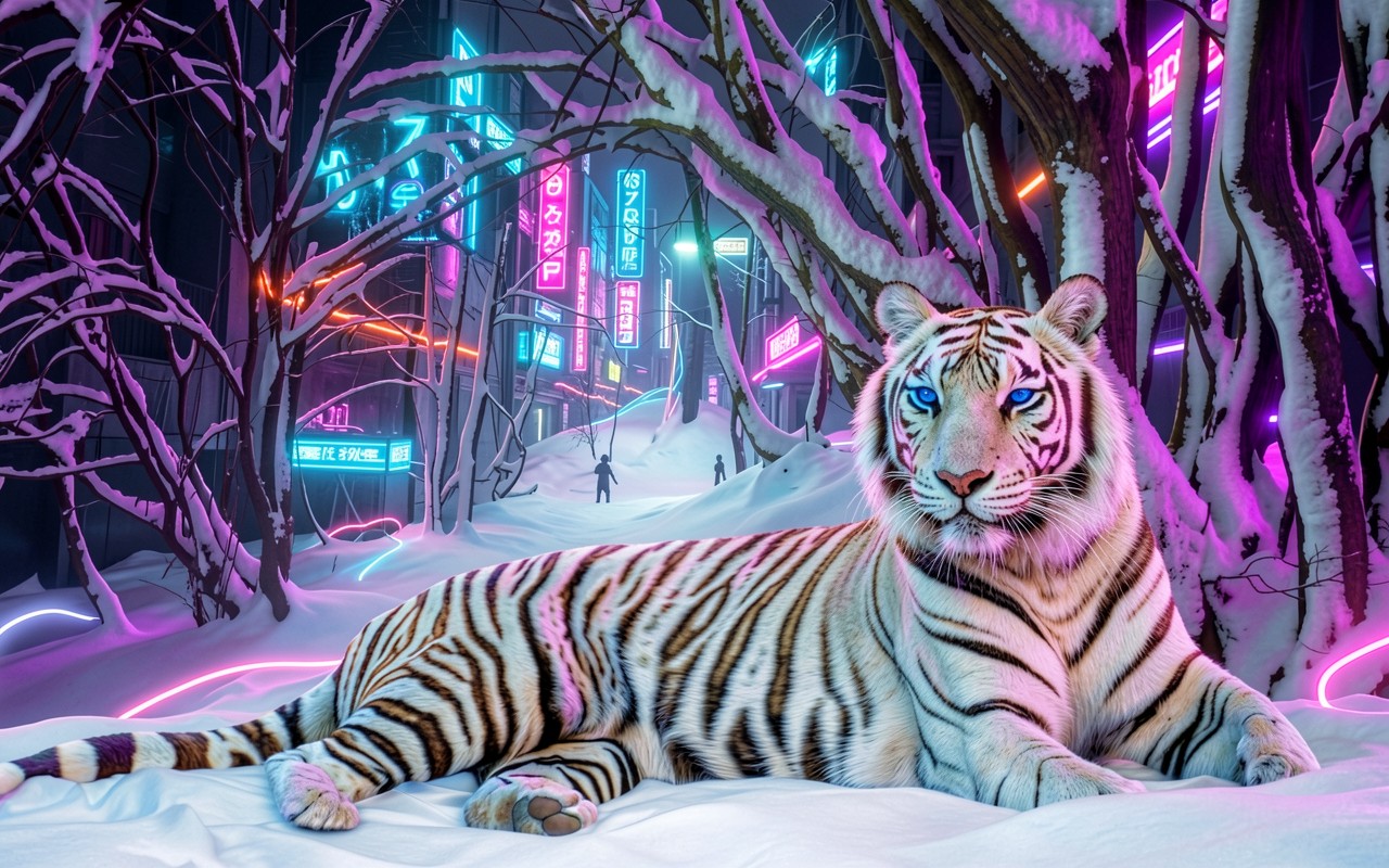 Белый тигр в неоновом зимнем городе