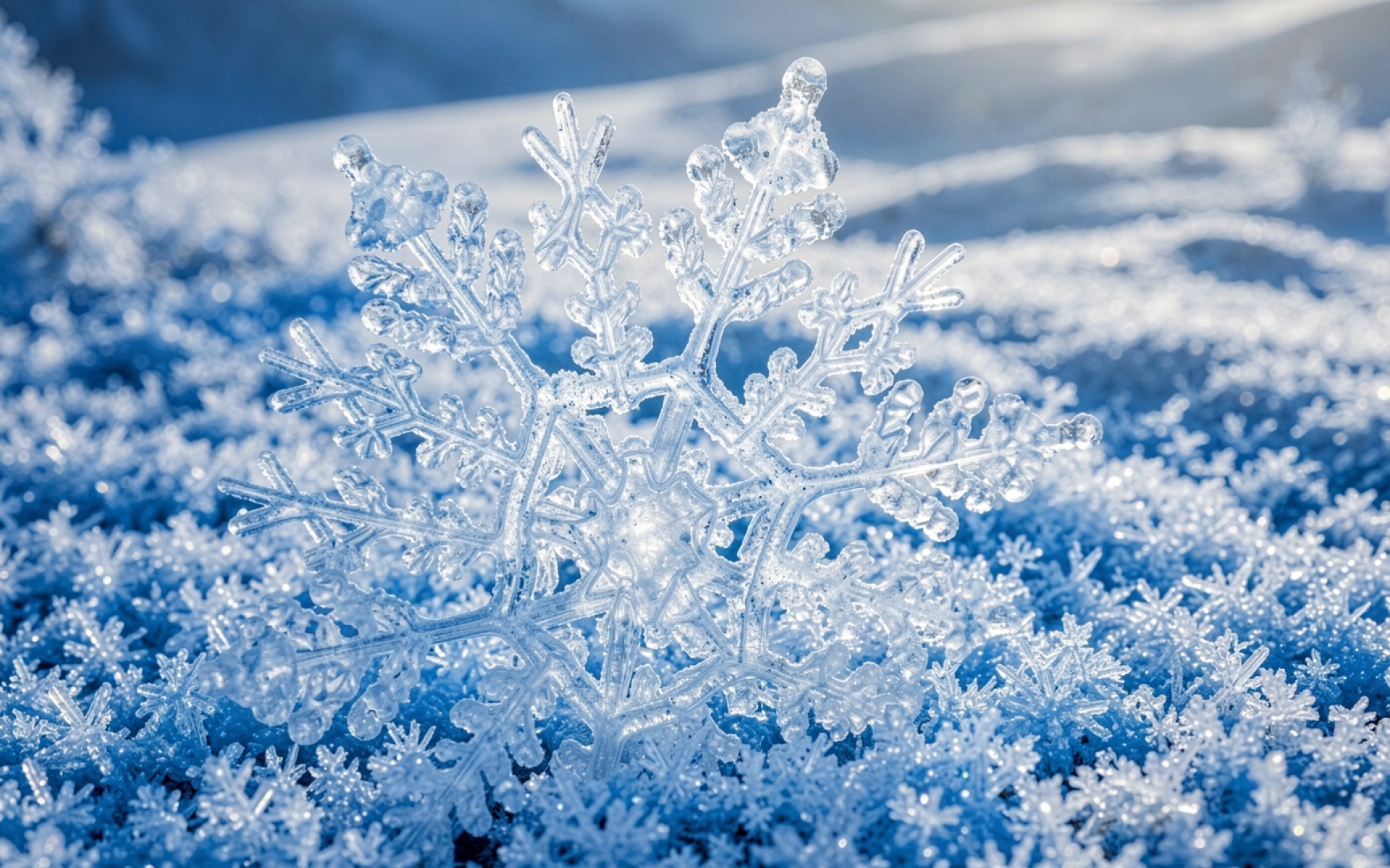 Кристалл снежинки синего цвета в зимнем лесу
