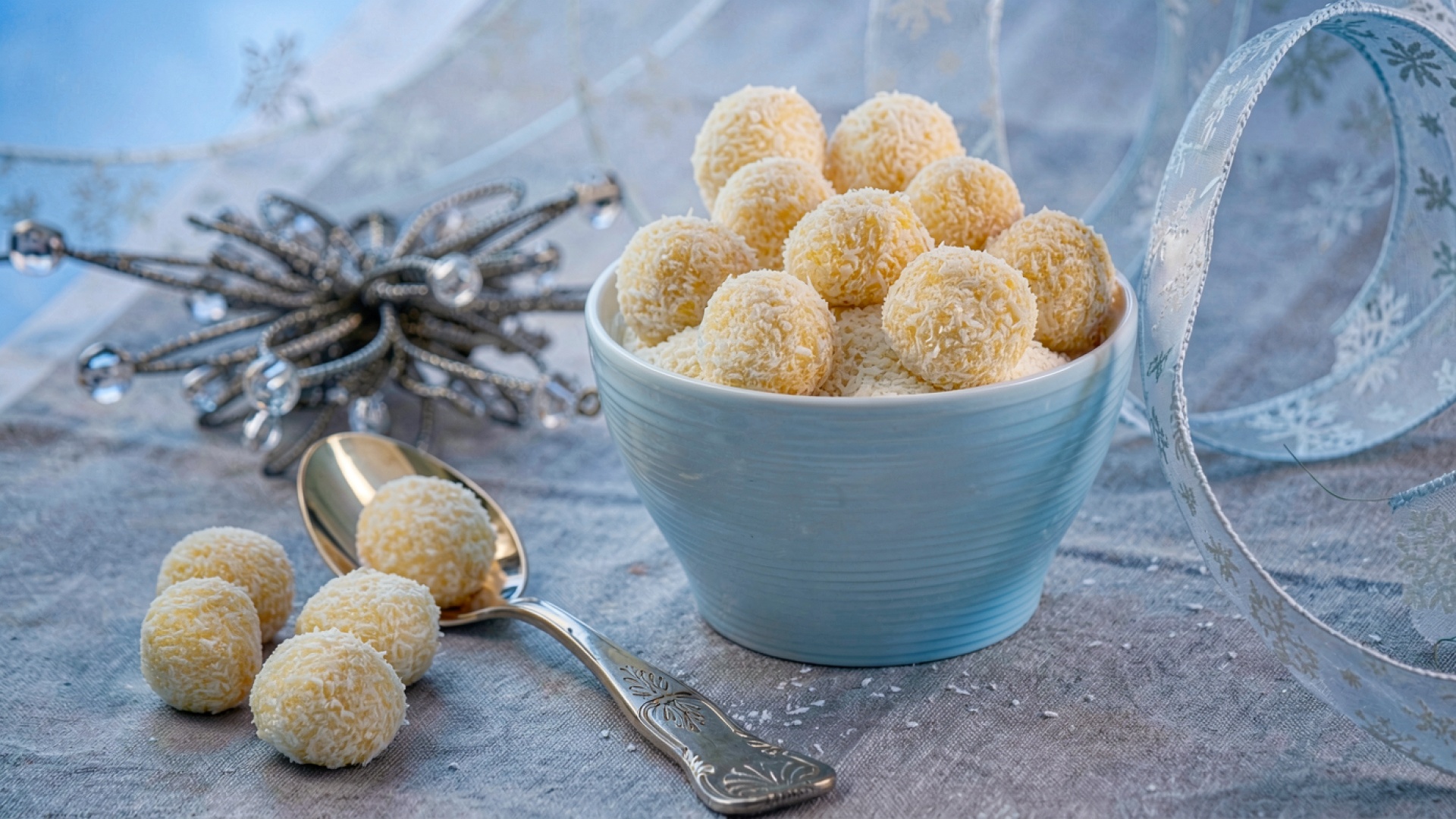 Кокосовые конфеты в голубой чаше зимний натюрморт