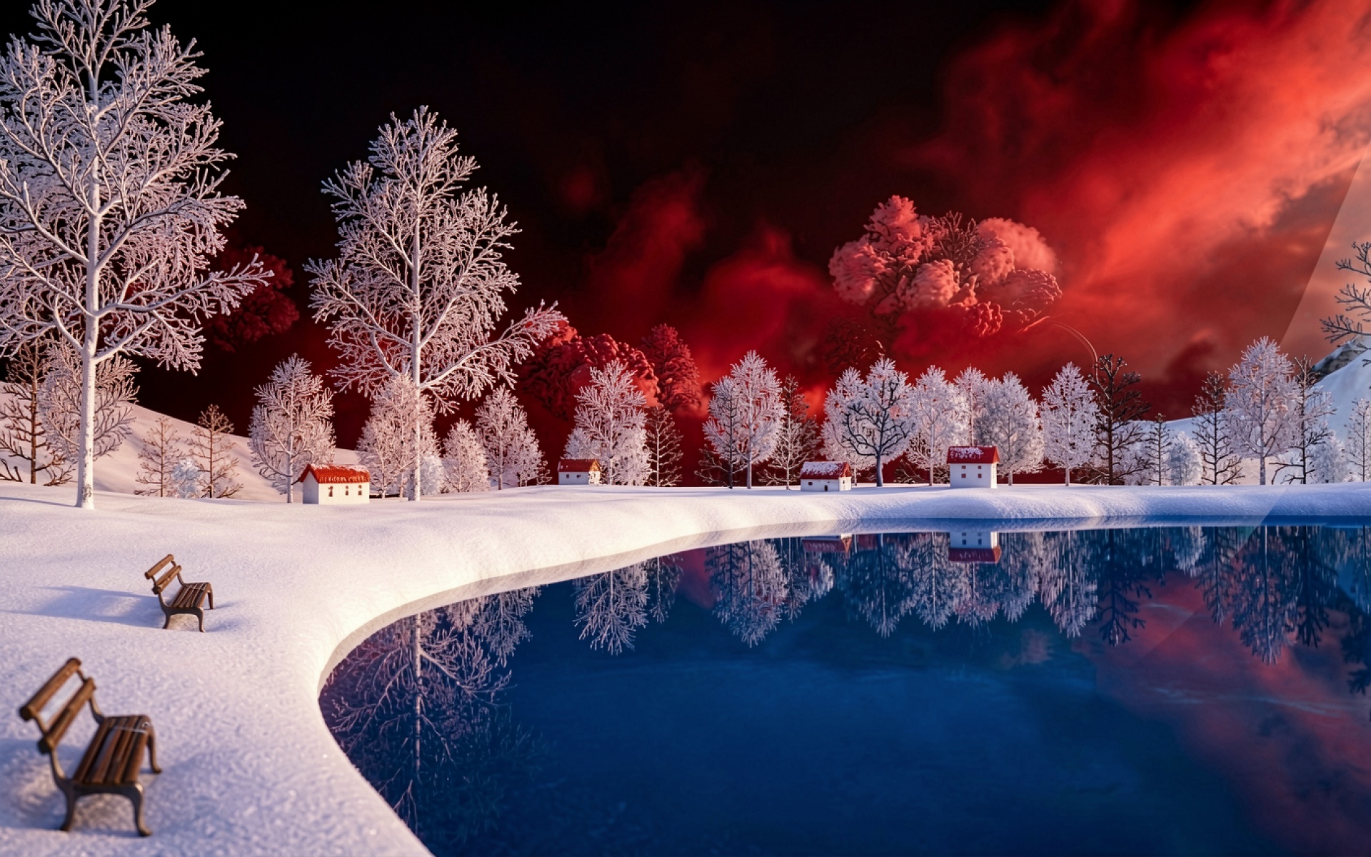 Зимний пейзаж с красным небом и озером