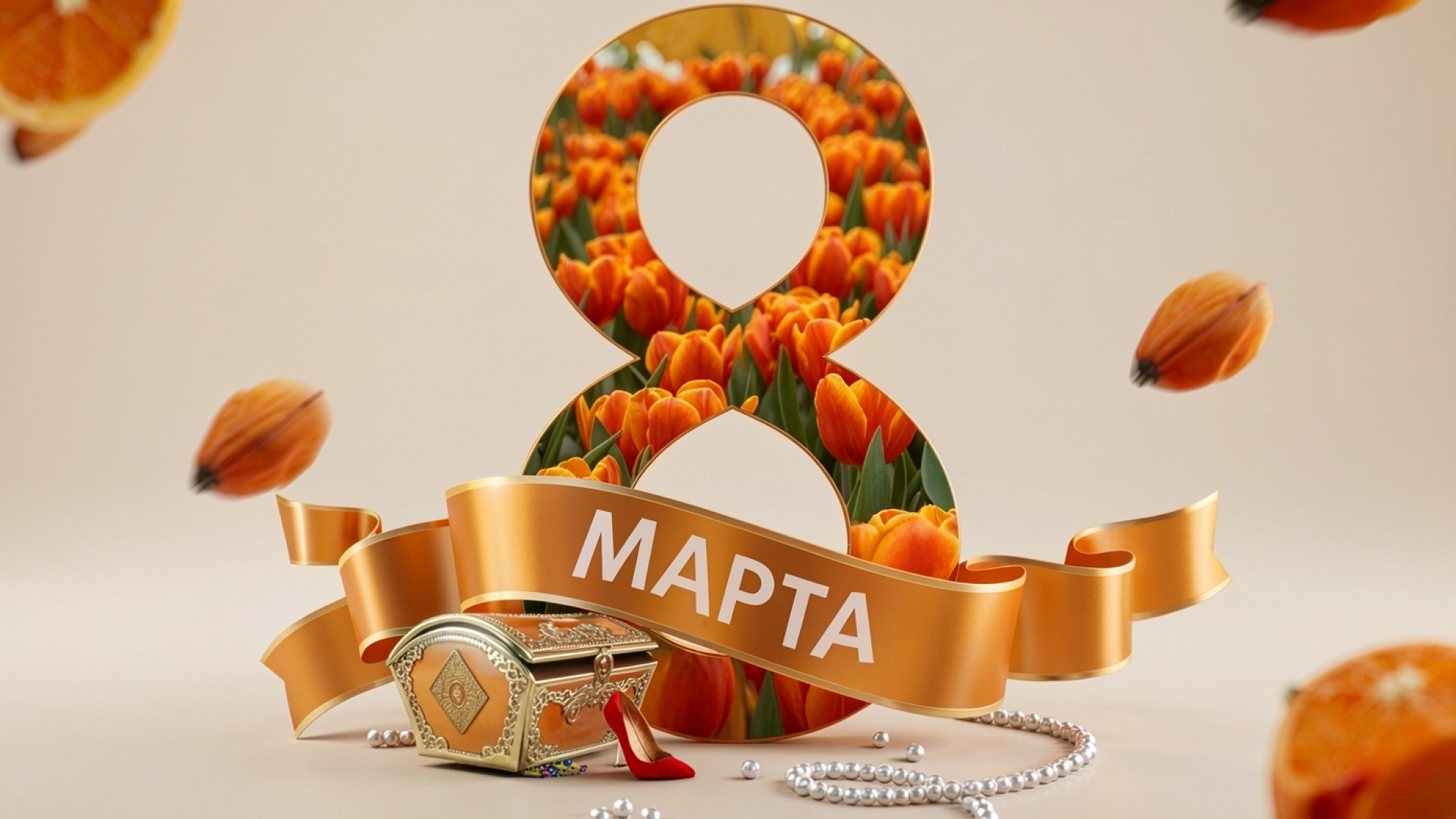 Золотая цифра восемь с оранжевыми тюльпанами