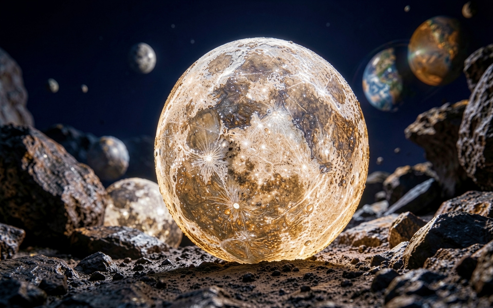 Золотистая светящаяся сфера на темном каменистом ландшафте