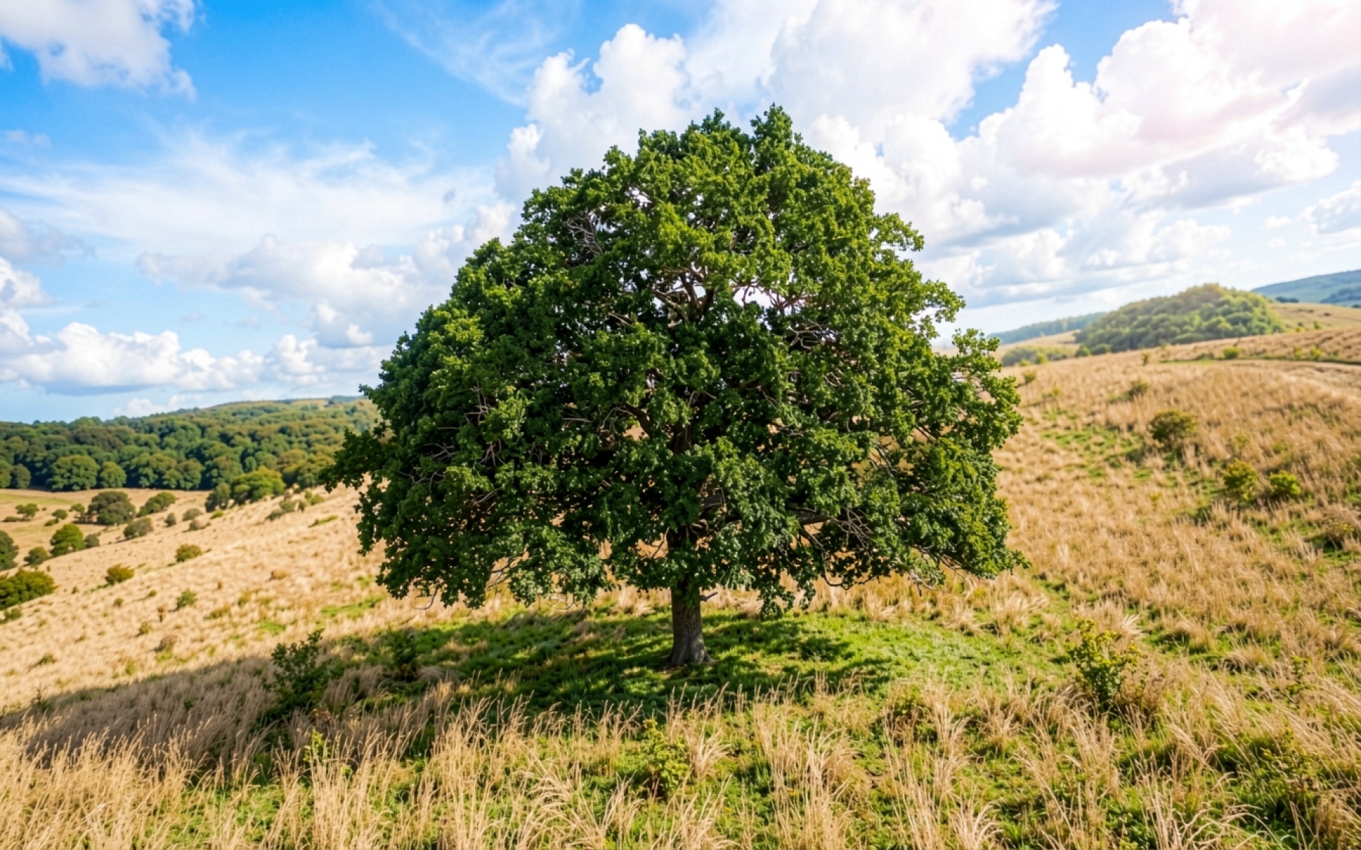 Одинокий зеленый дуб в золотистом поле