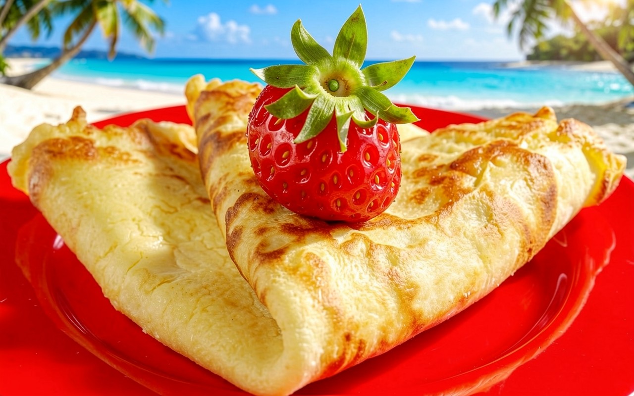 Золотистые блины с клубникой на пляже