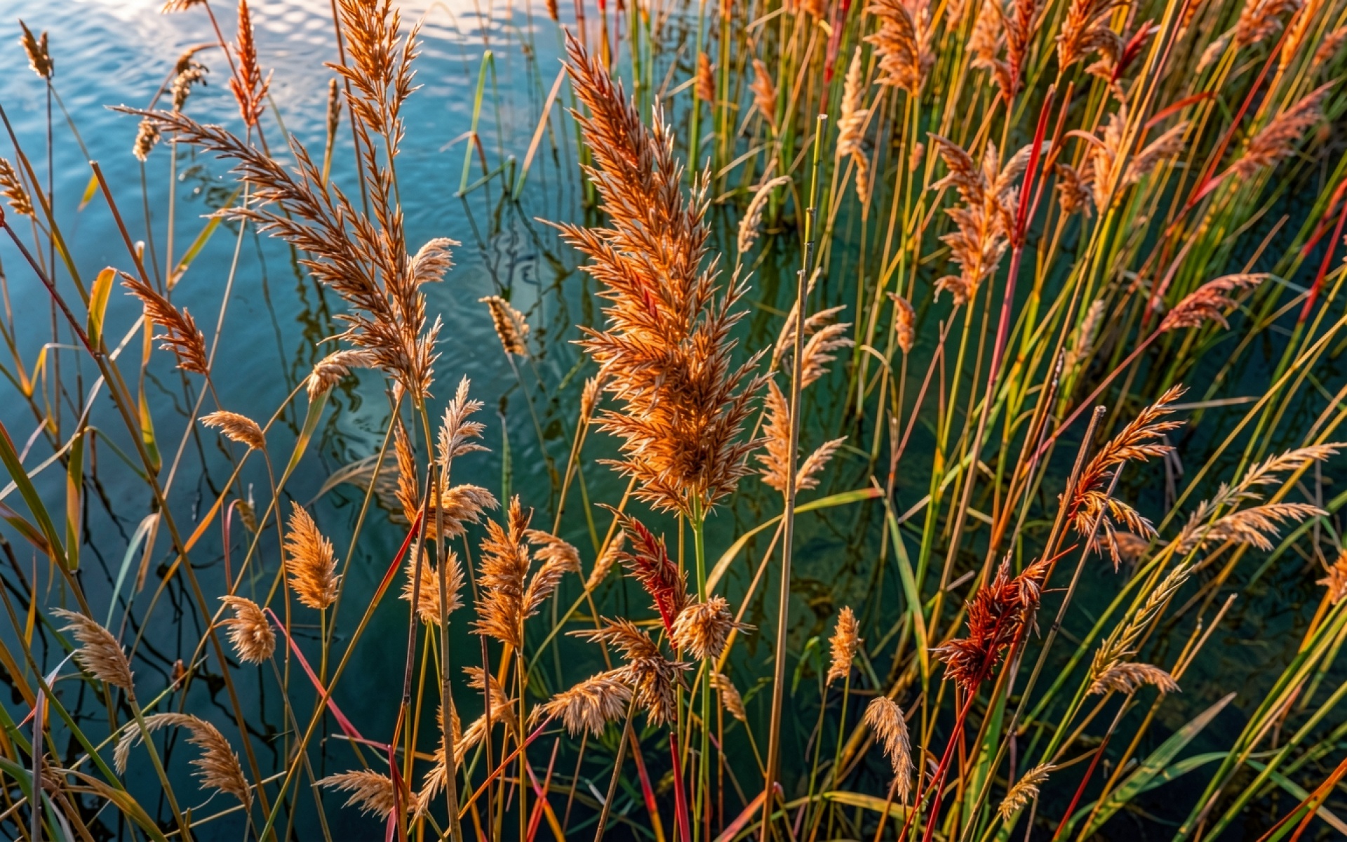 Золотистый камыш на фоне синей воды