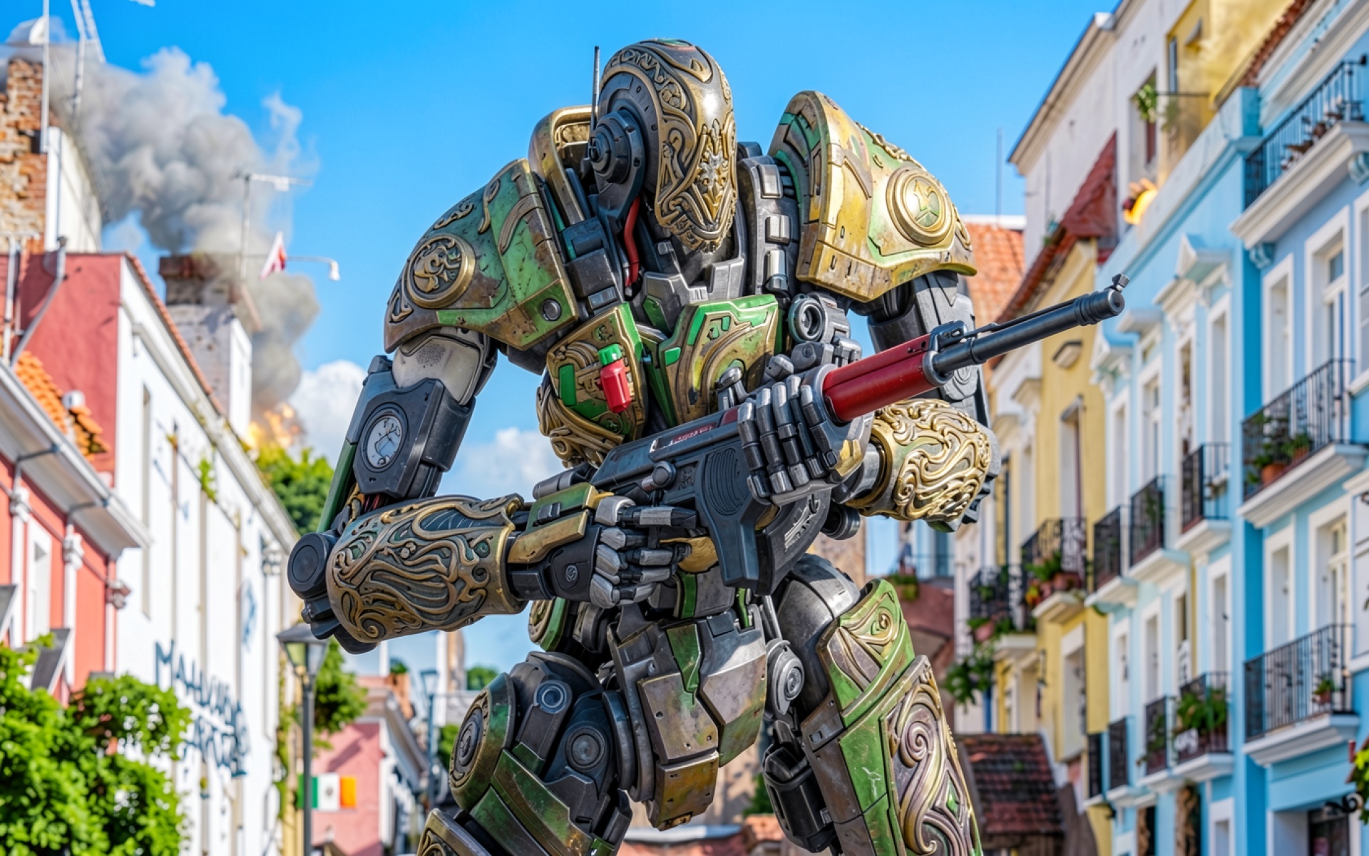 Золотой боевой робот в городском квартале