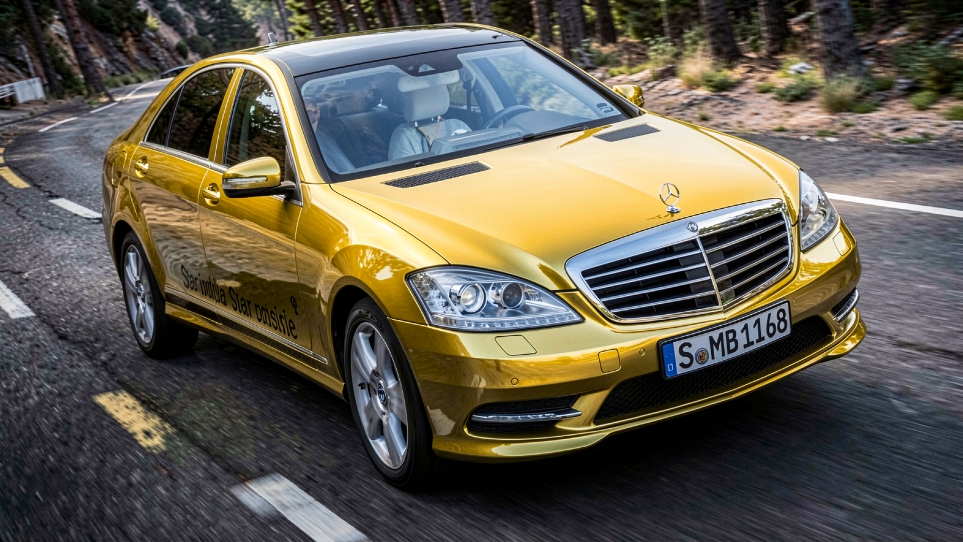 Золотой Mercedes S-class в движении горная дорога