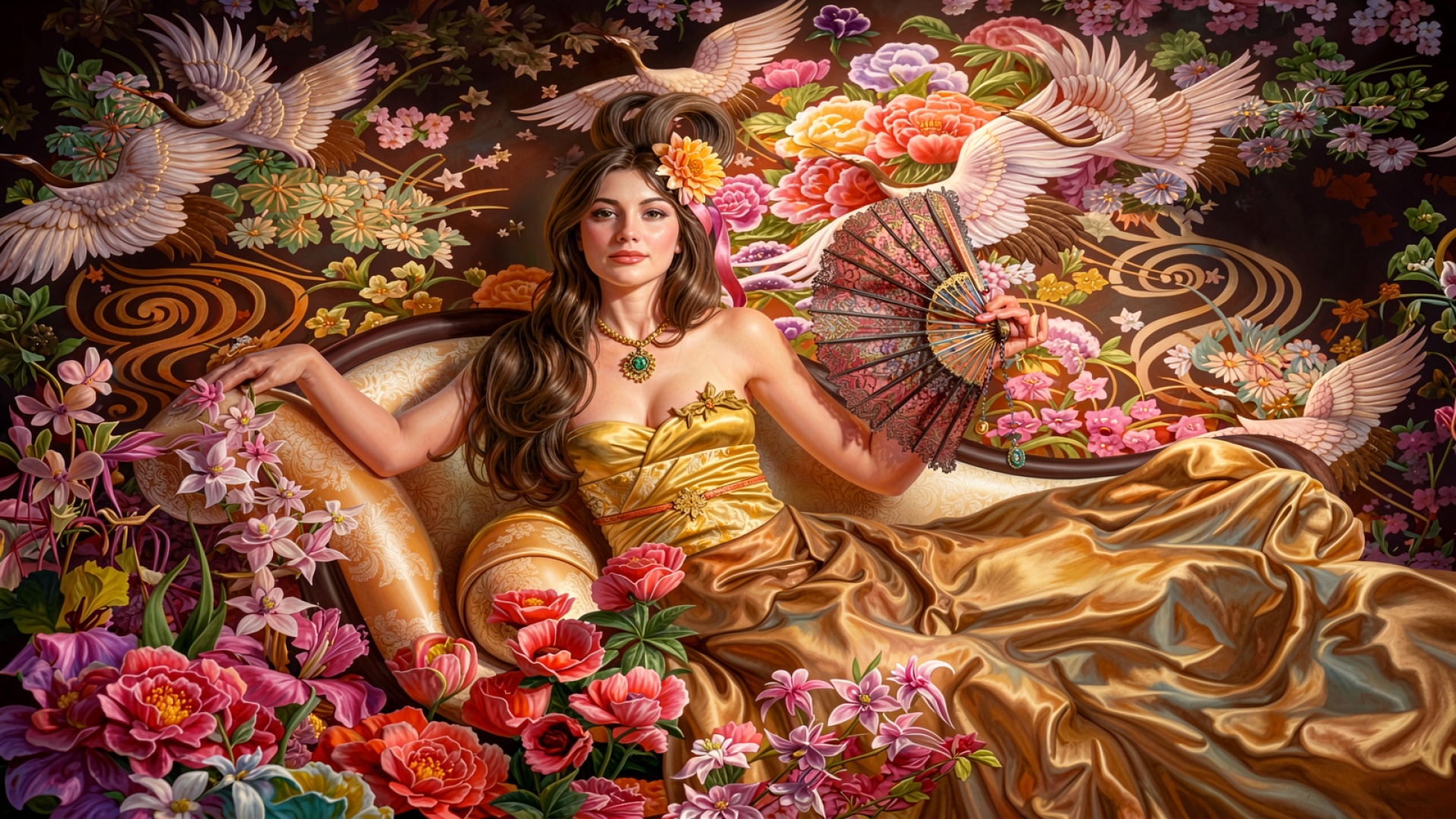 Девушка в золотом платье с веером