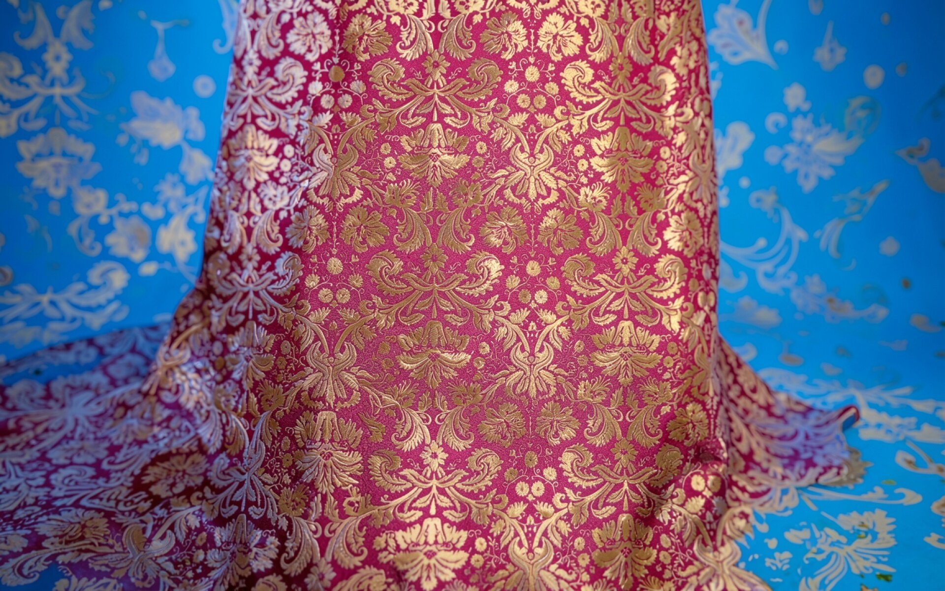 Розовая шелковая ткань с золотым узором