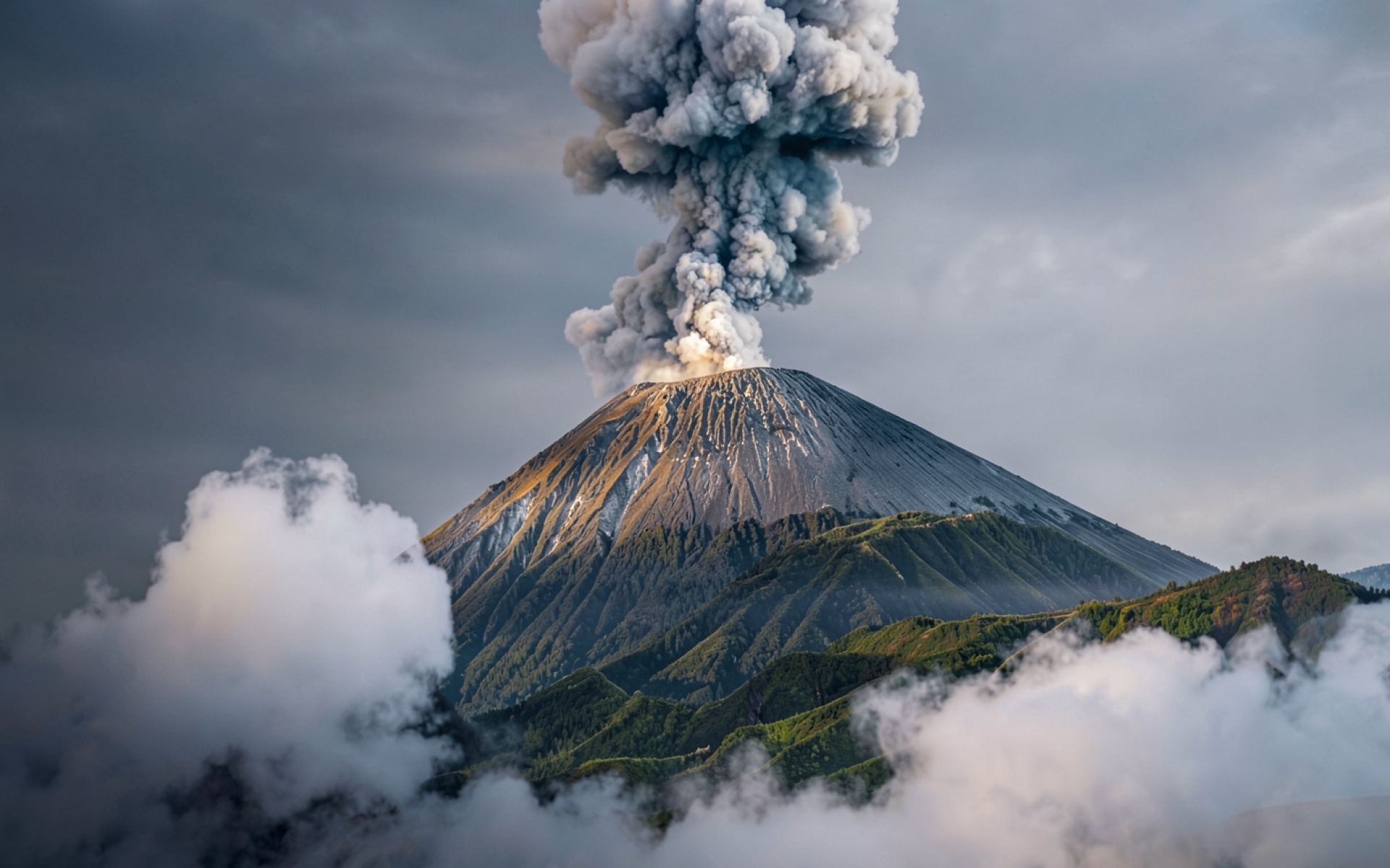 Извергающийся вулкан в серых облаках при закате