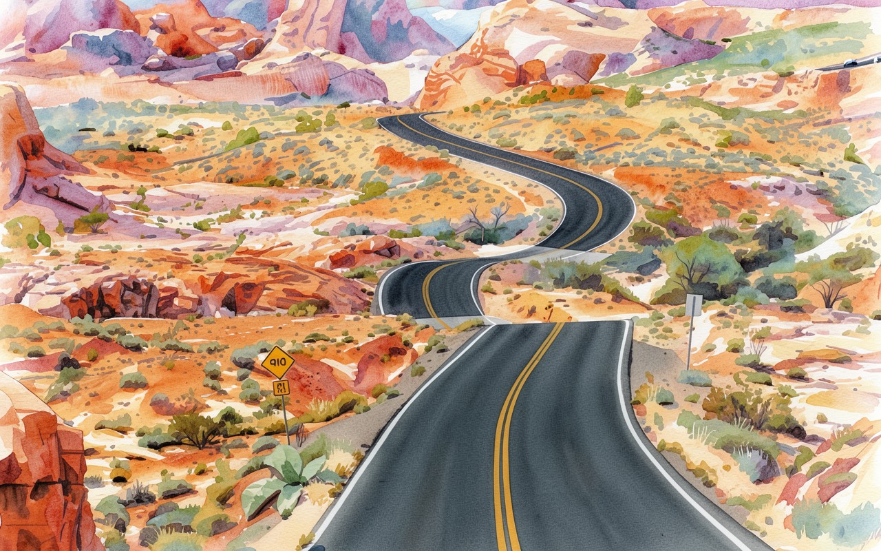 Извилистая дорога в красном каньоне акварель