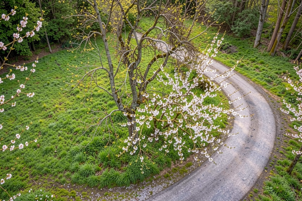 Цветущее белое дерево у извилистой дороги