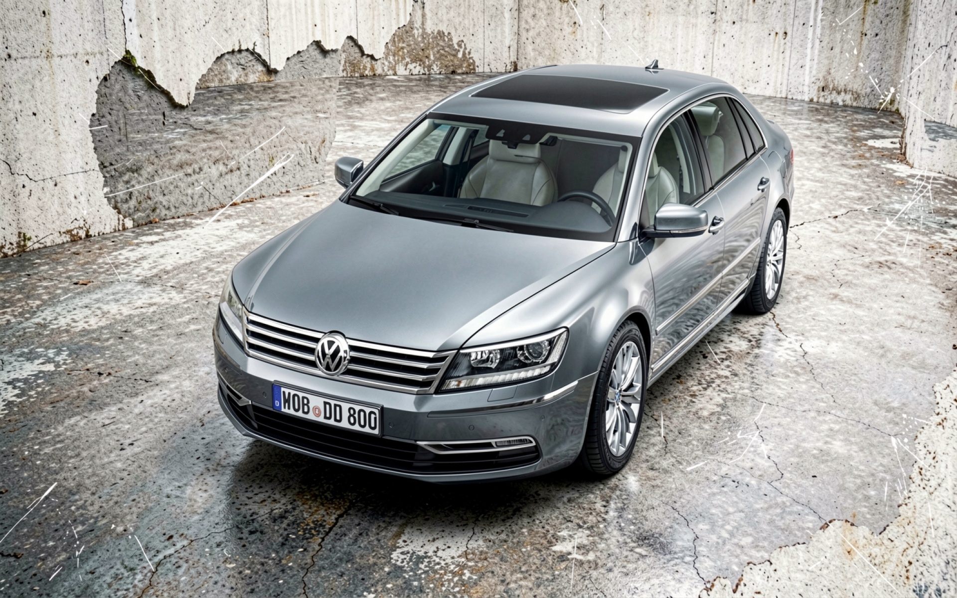 Серебристый седан Volkswagen в бетонном индустриальном ангаре