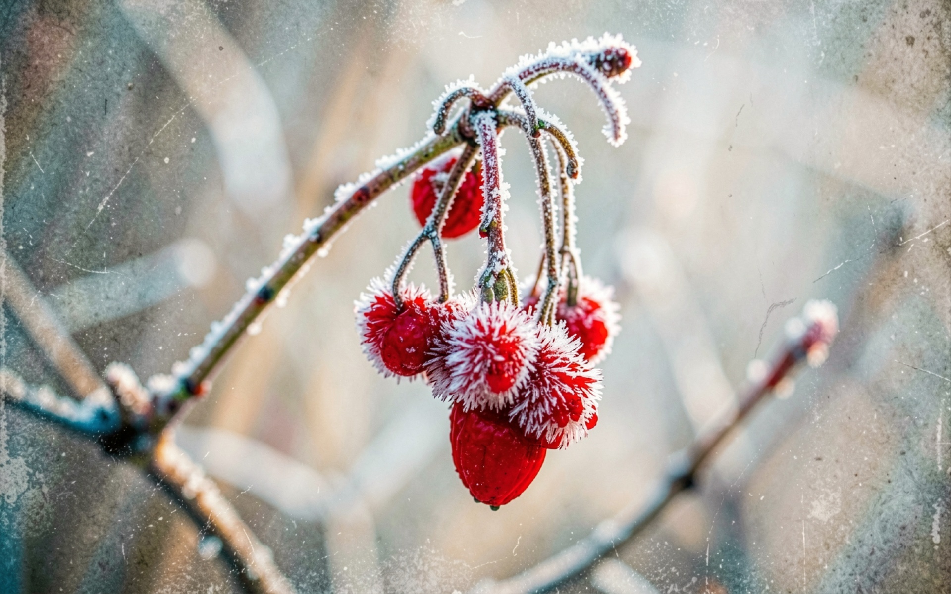 Красные ягоды в инее зимний лес