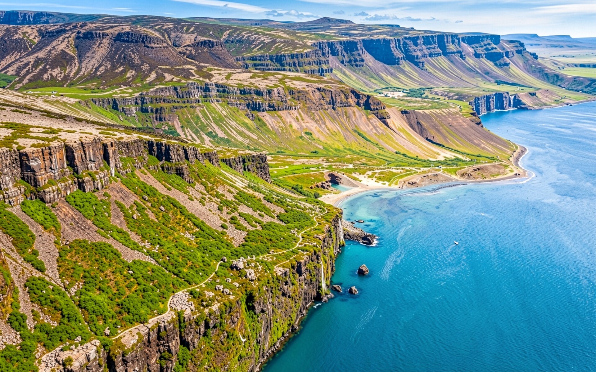 Пейзаж скалистого побережья Исландии с бирюзовым океаном