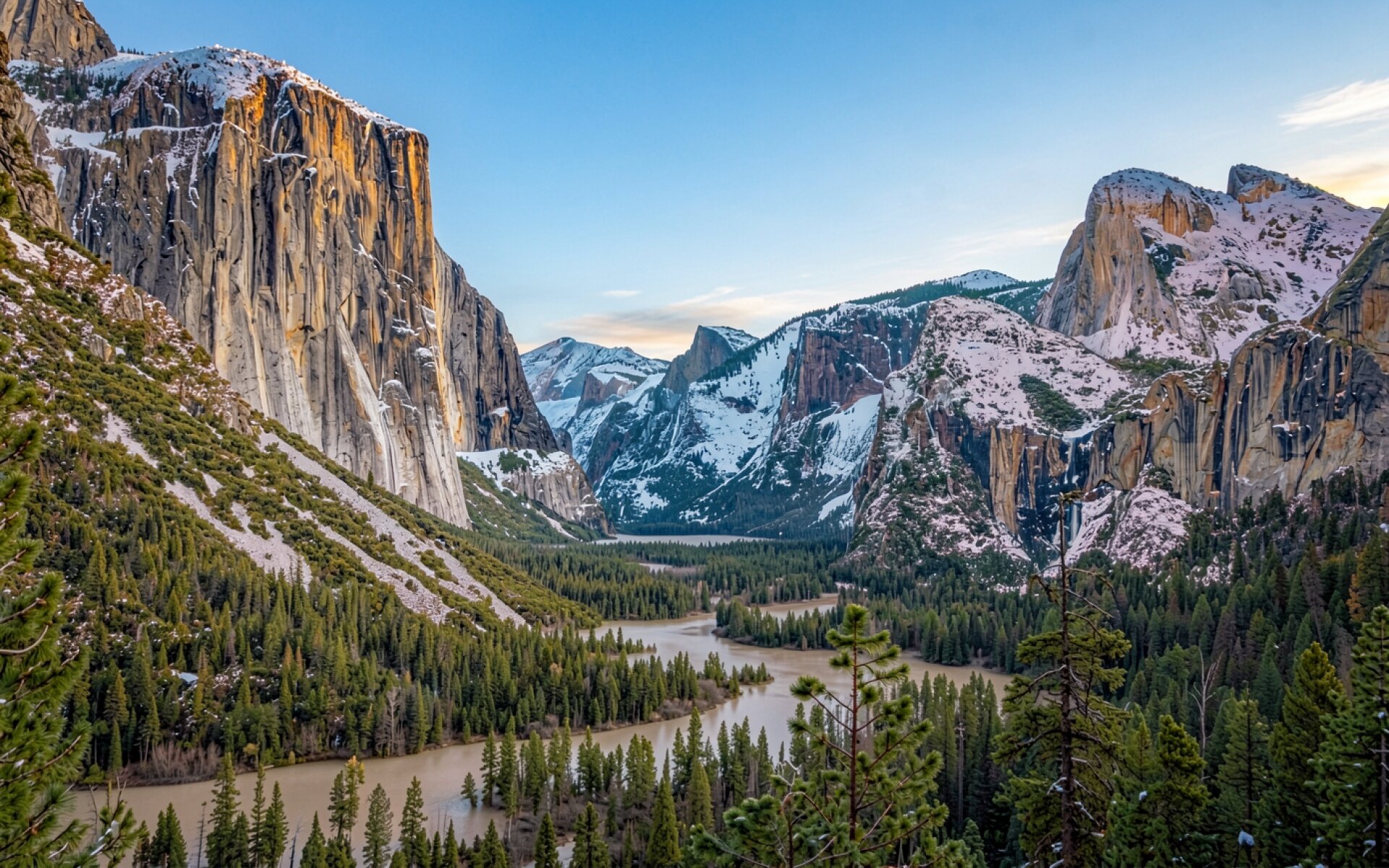 Зимний пейзаж долины Йосемити с заснеженными скалами