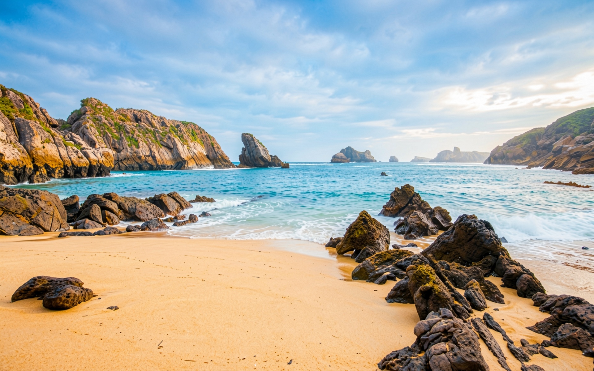 Каменистый пляж с бирюзовой водой и скалами