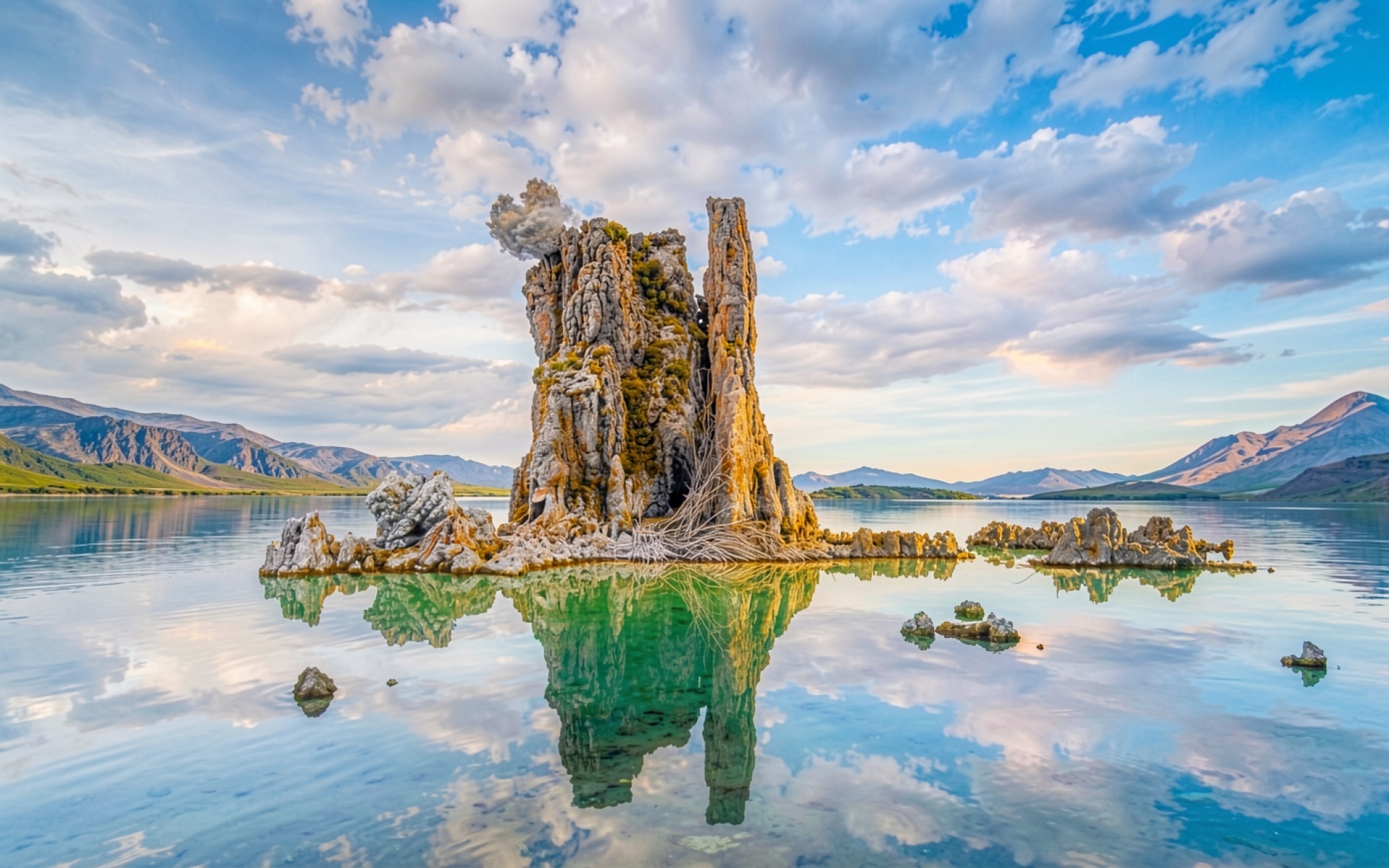 Каменная скала в бирюзовом озере при закате