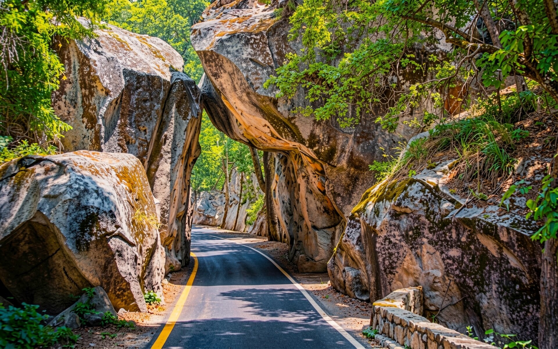 Горная дорога под каменной аркой в лесу