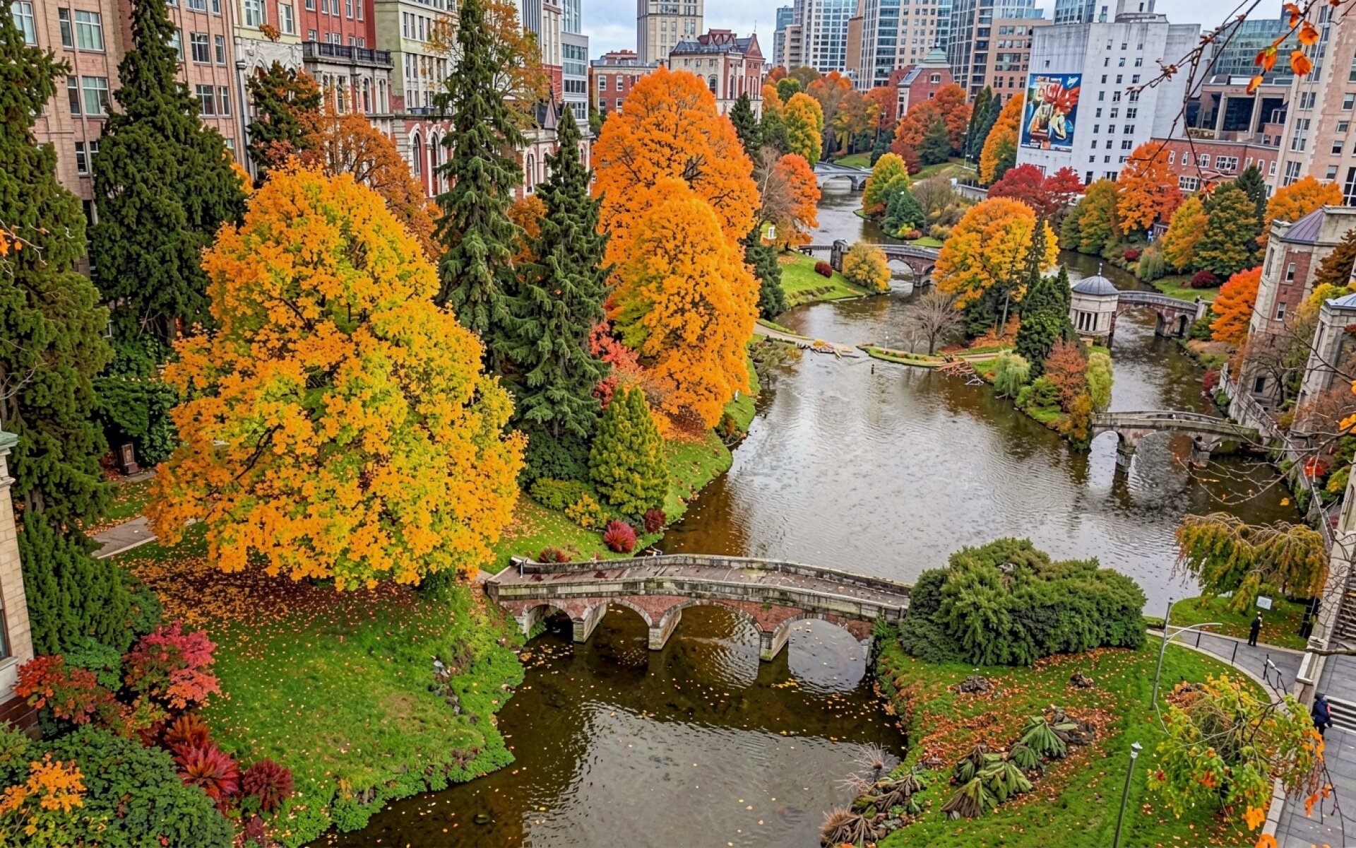 Осенний парк с каменными мостами и рекой