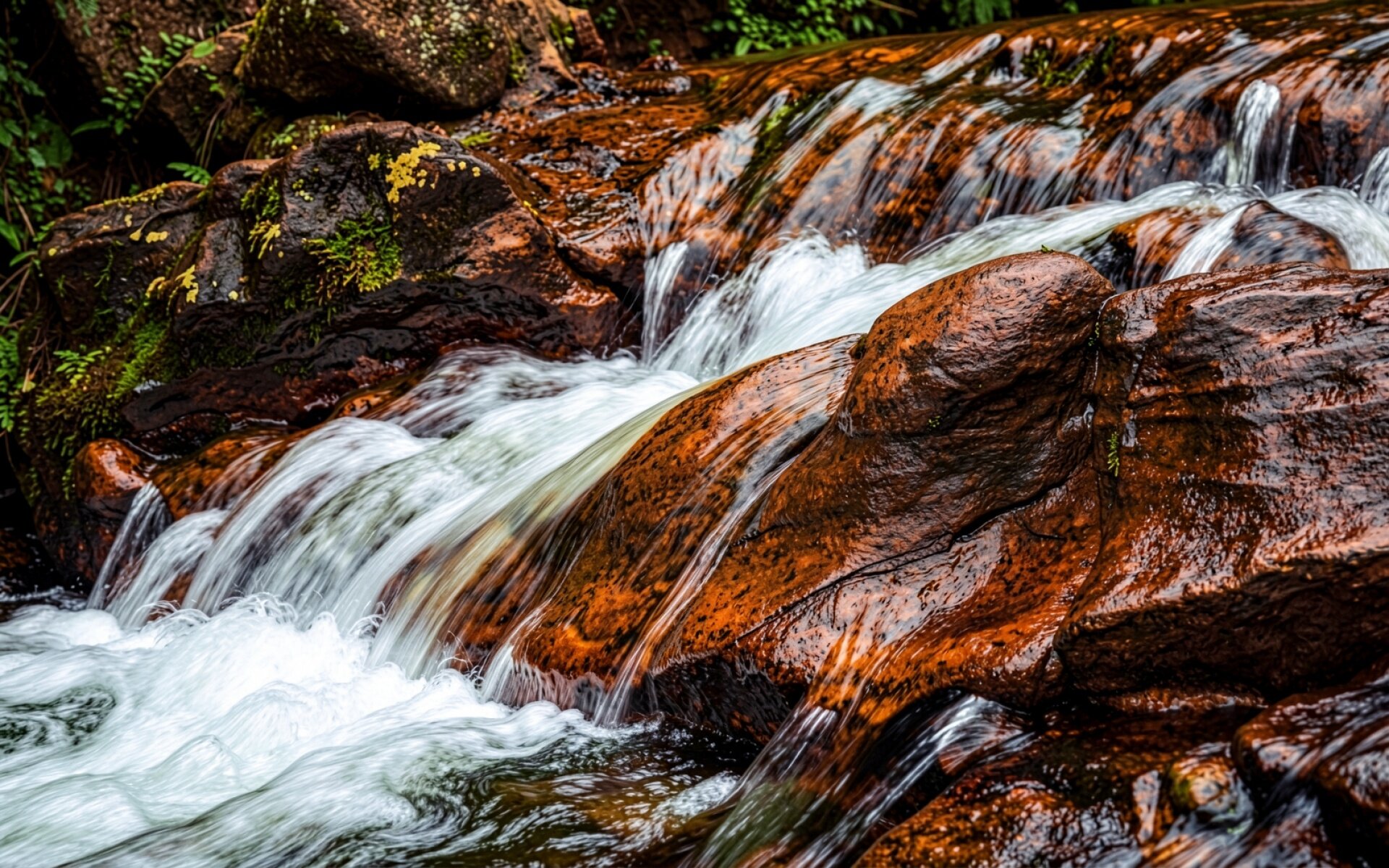 Горный водопад среди рыжих камней леса
