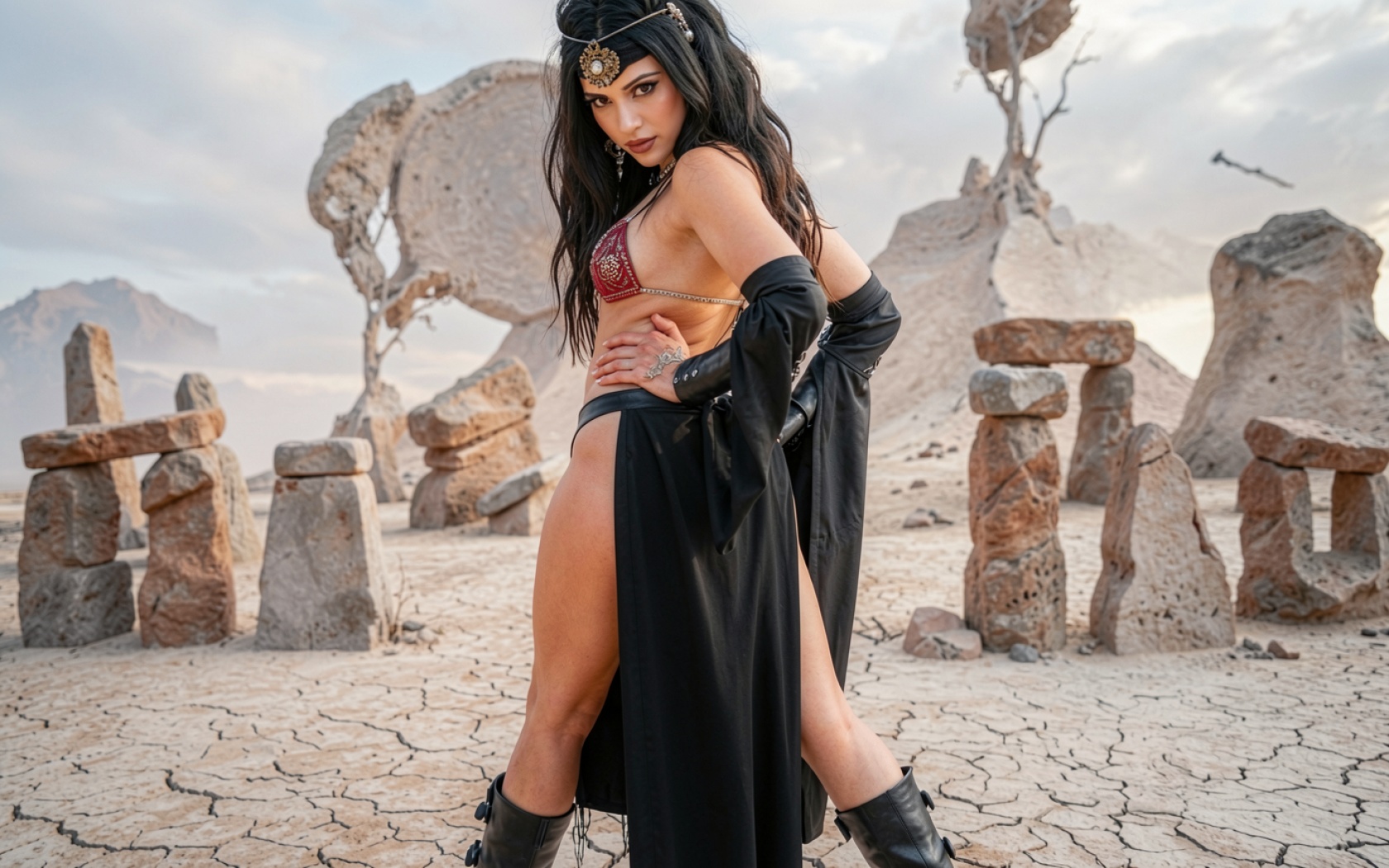 Девушка в черном наряде среди камней