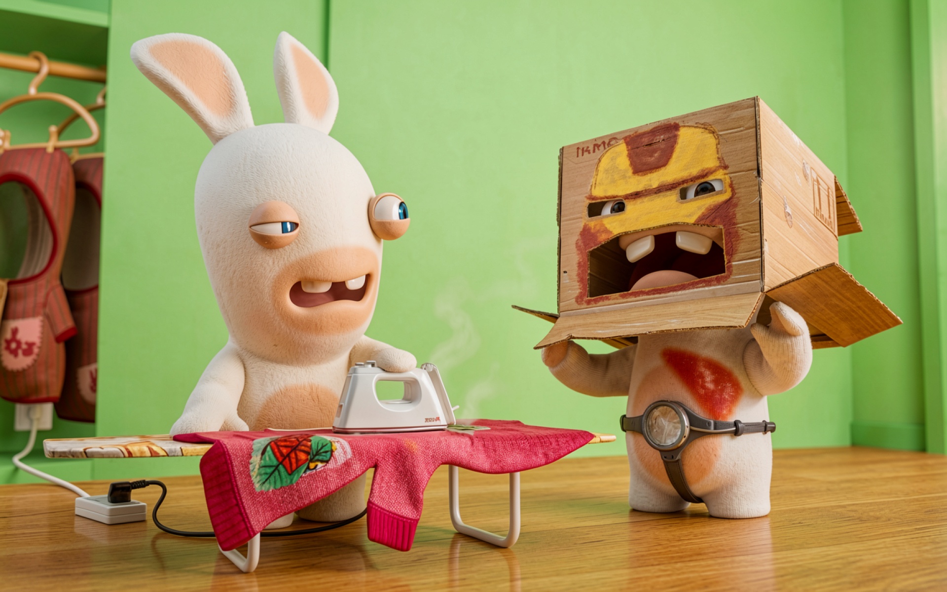 Белый кролик и персонаж в картонной коробке
