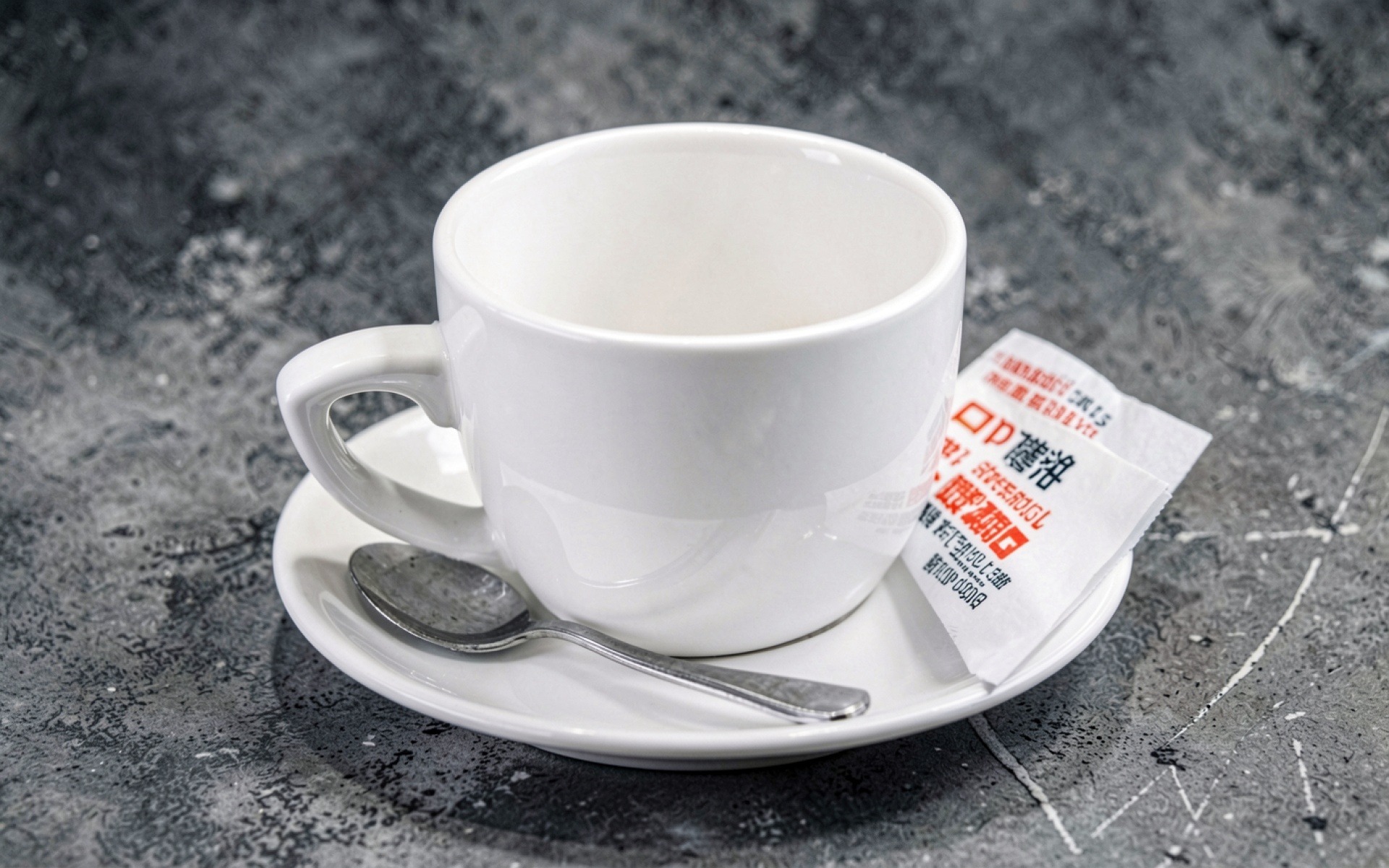 Белая керамическая чашка на сером бетонном фоне