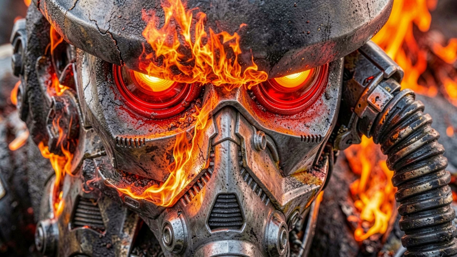 Киберпанк робот с огненными глазами в пламени