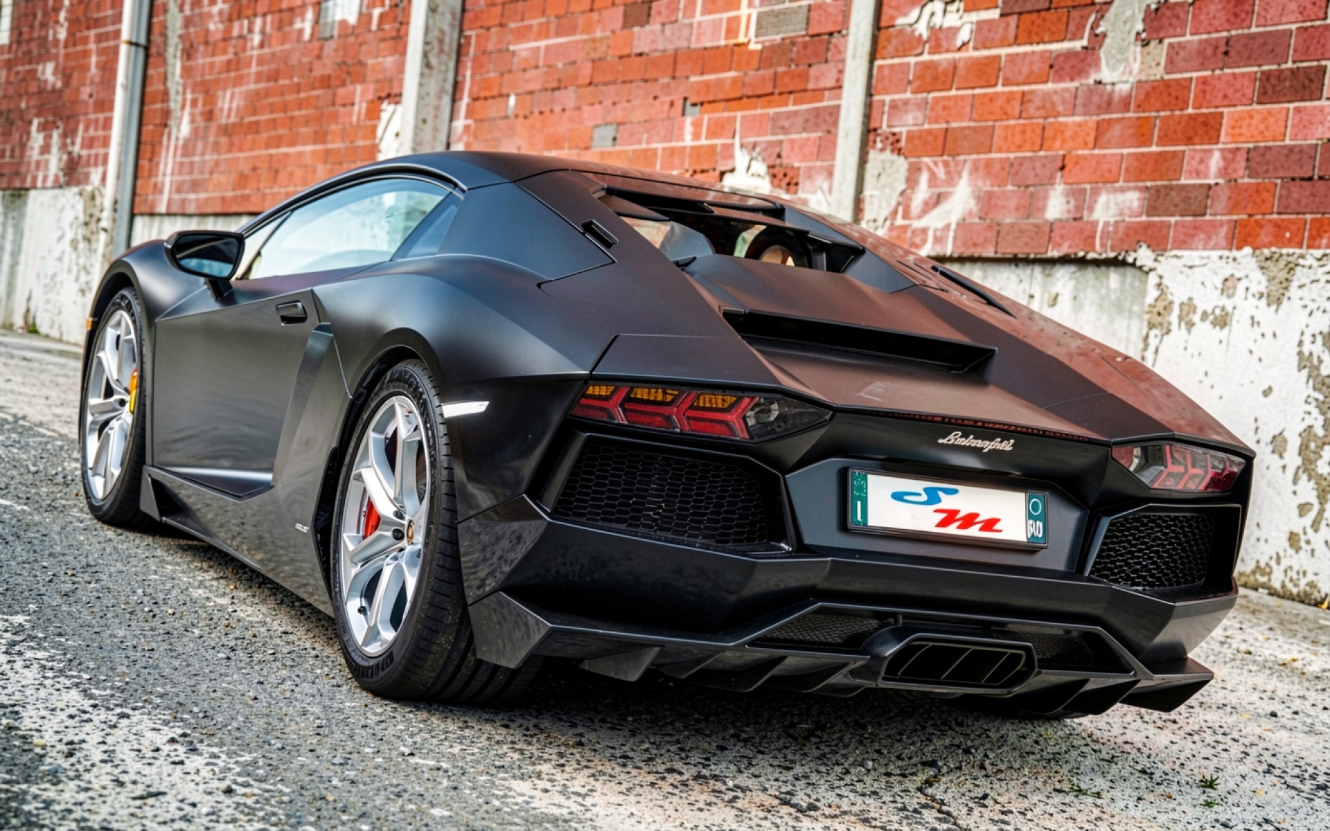 Черный матовый Lamborghini Aventador на фоне кирпичной стены