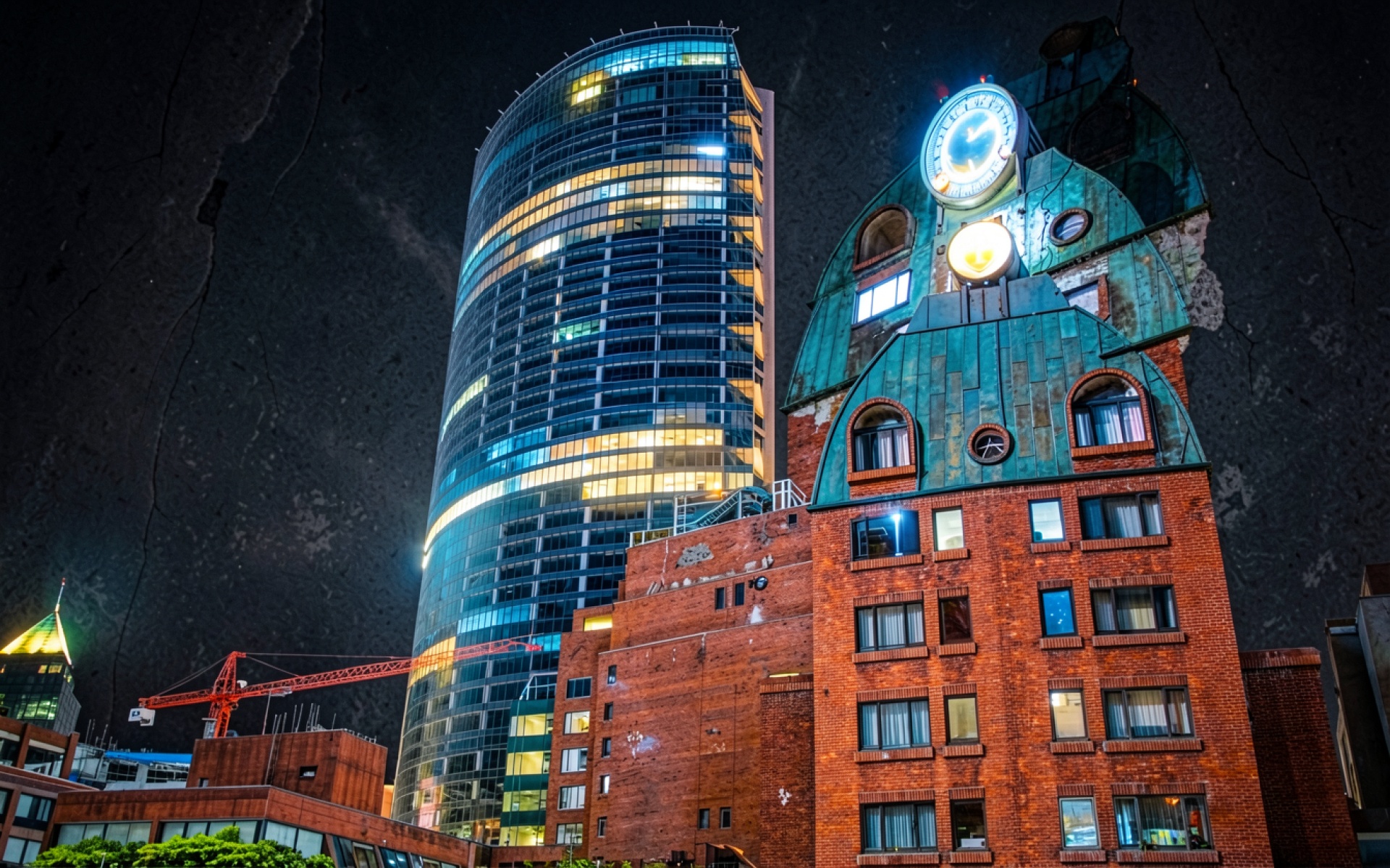 Ночной город с небоскребом и кирпичным зданием