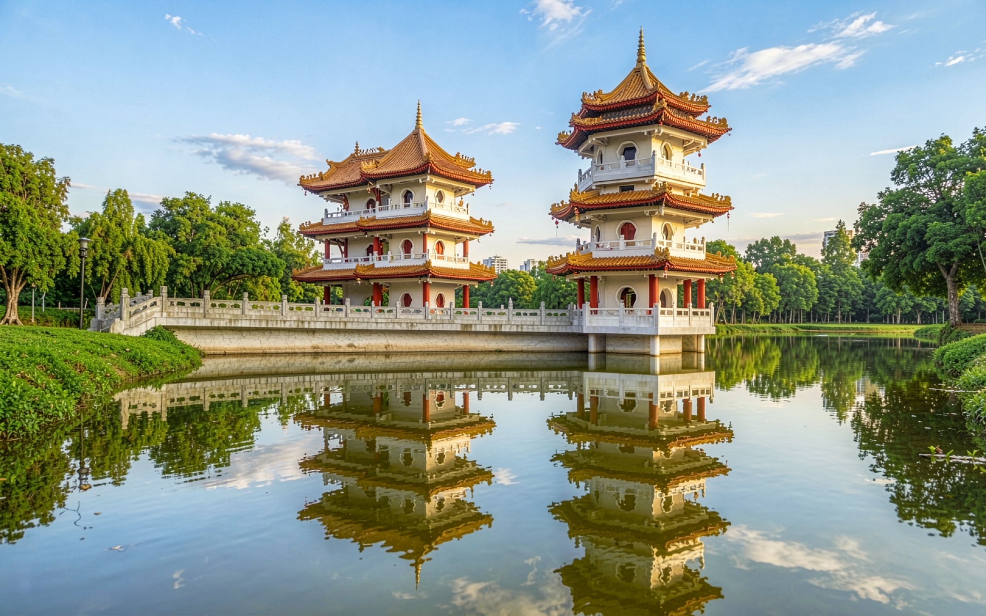 Китайские пагоды у озера в солнечный день