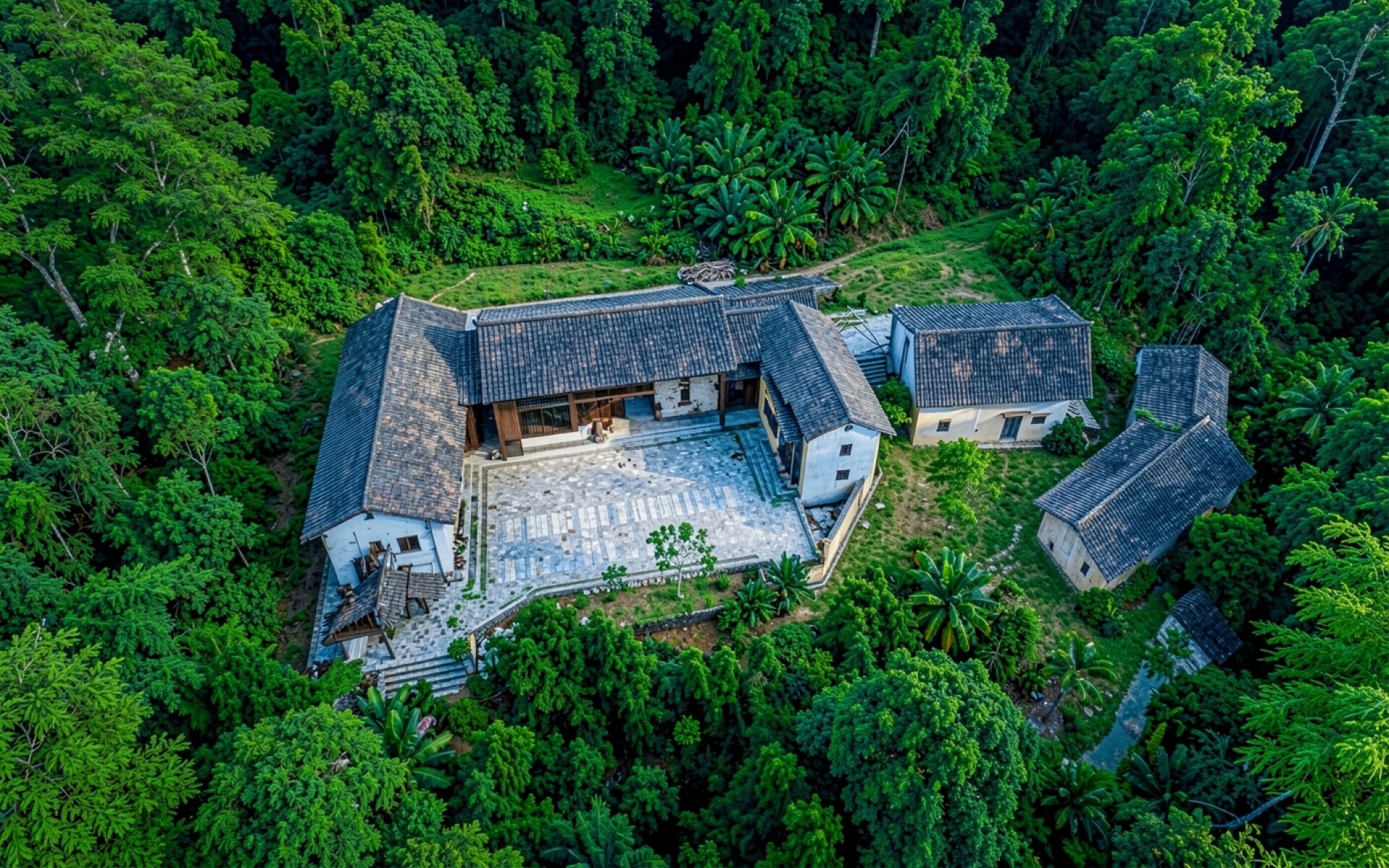 Китайский традиционный дом в густом зеленом лесу