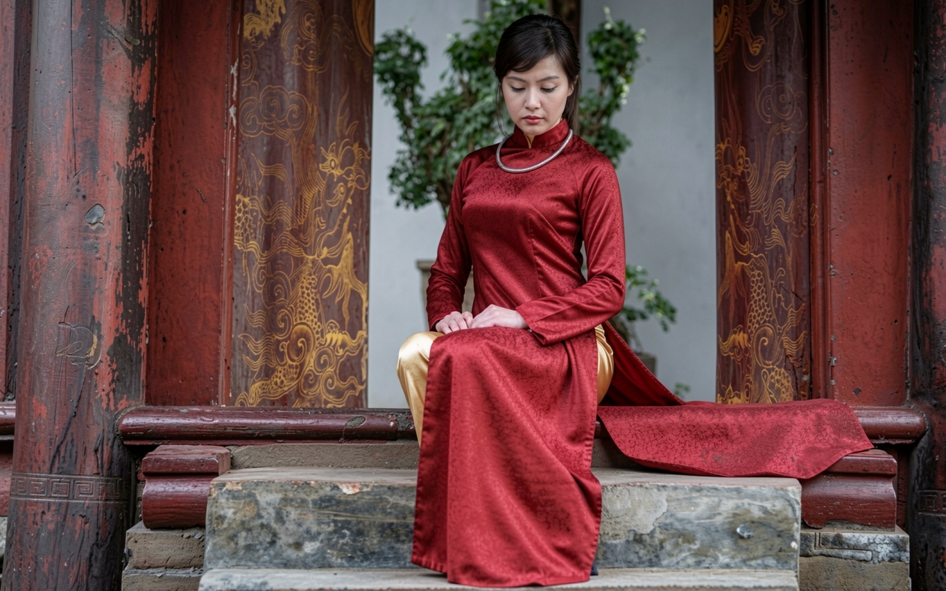 Девушка в красном платье в китайском храме