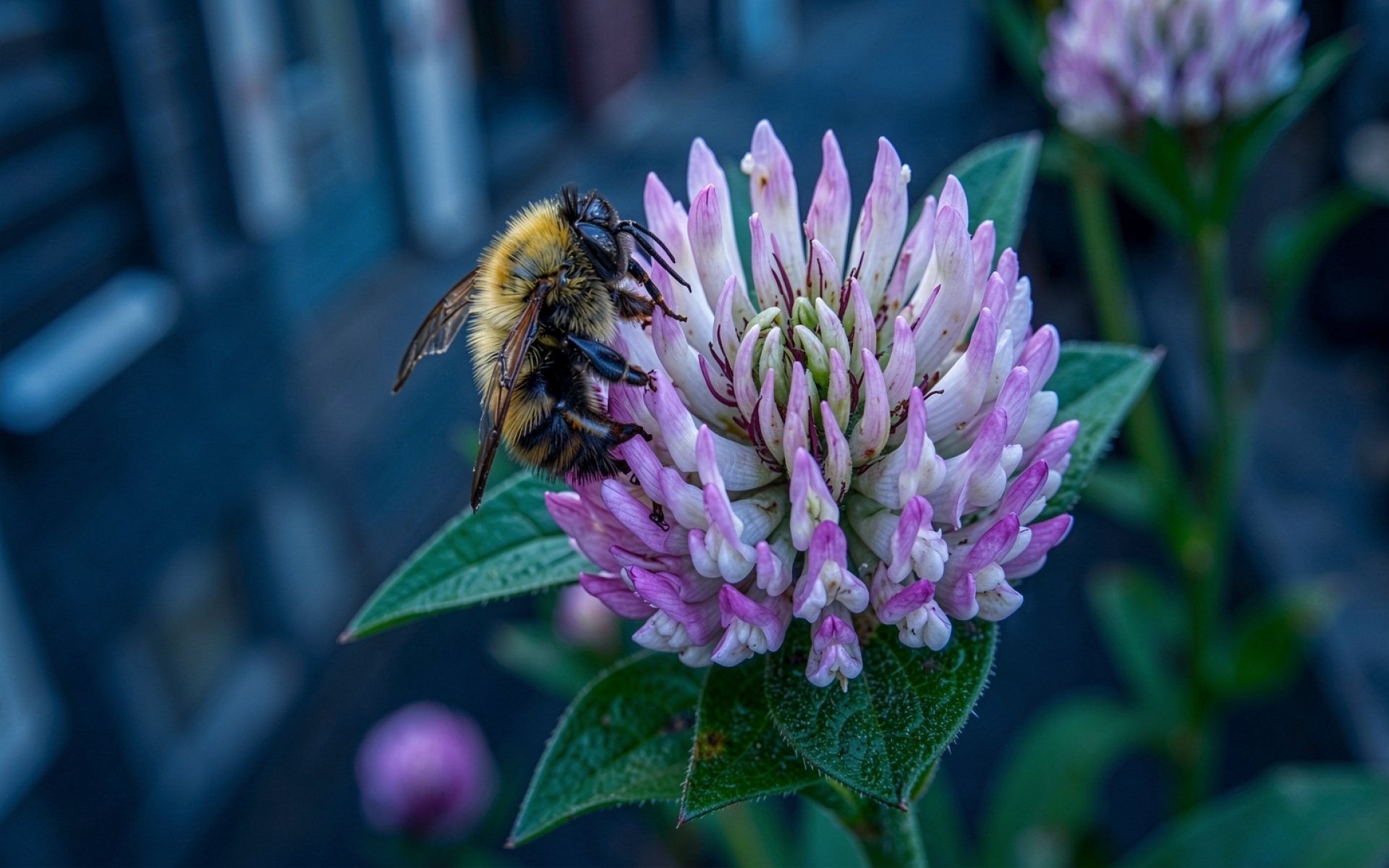 Шмель на розовом цветке клевера макросъемка