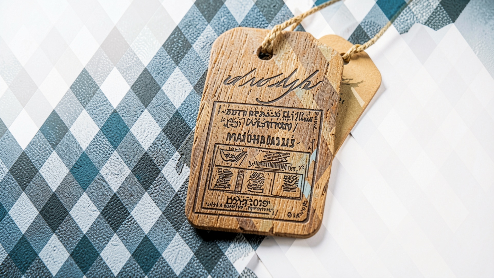 Деревянная бирка с гравировкой на клетчатом фоне