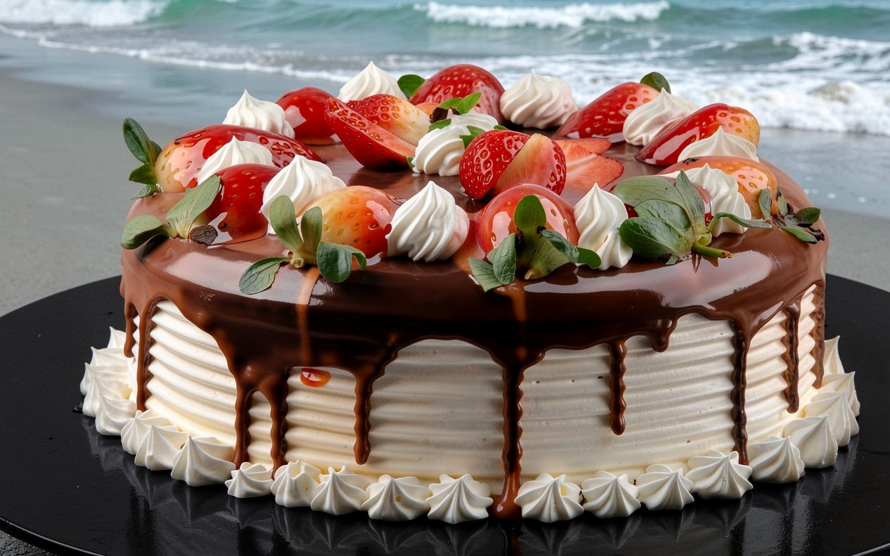 Шоколадный торт с клубникой на пляже