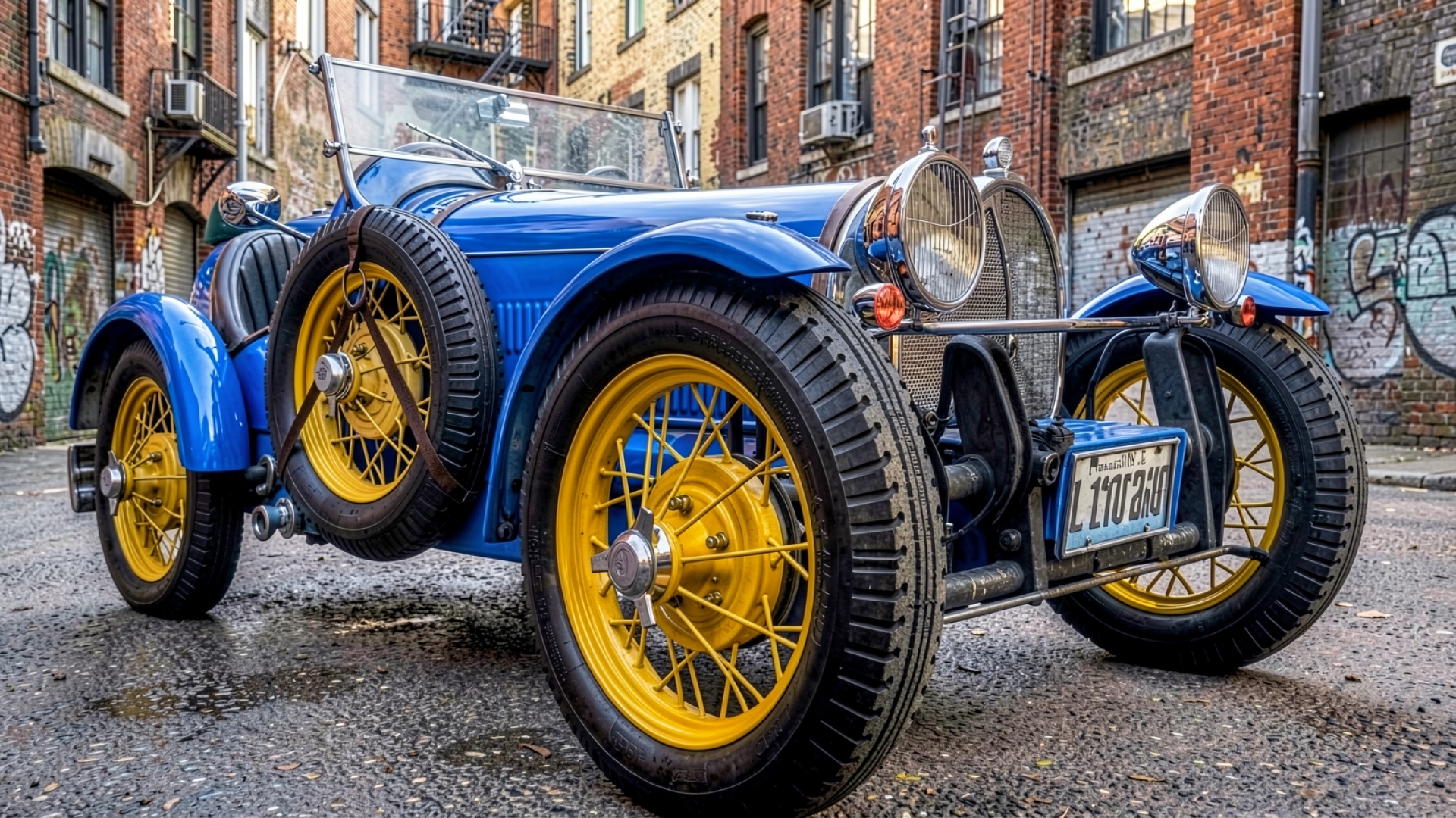Синий ретро автомобиль с желтыми колесами в городе